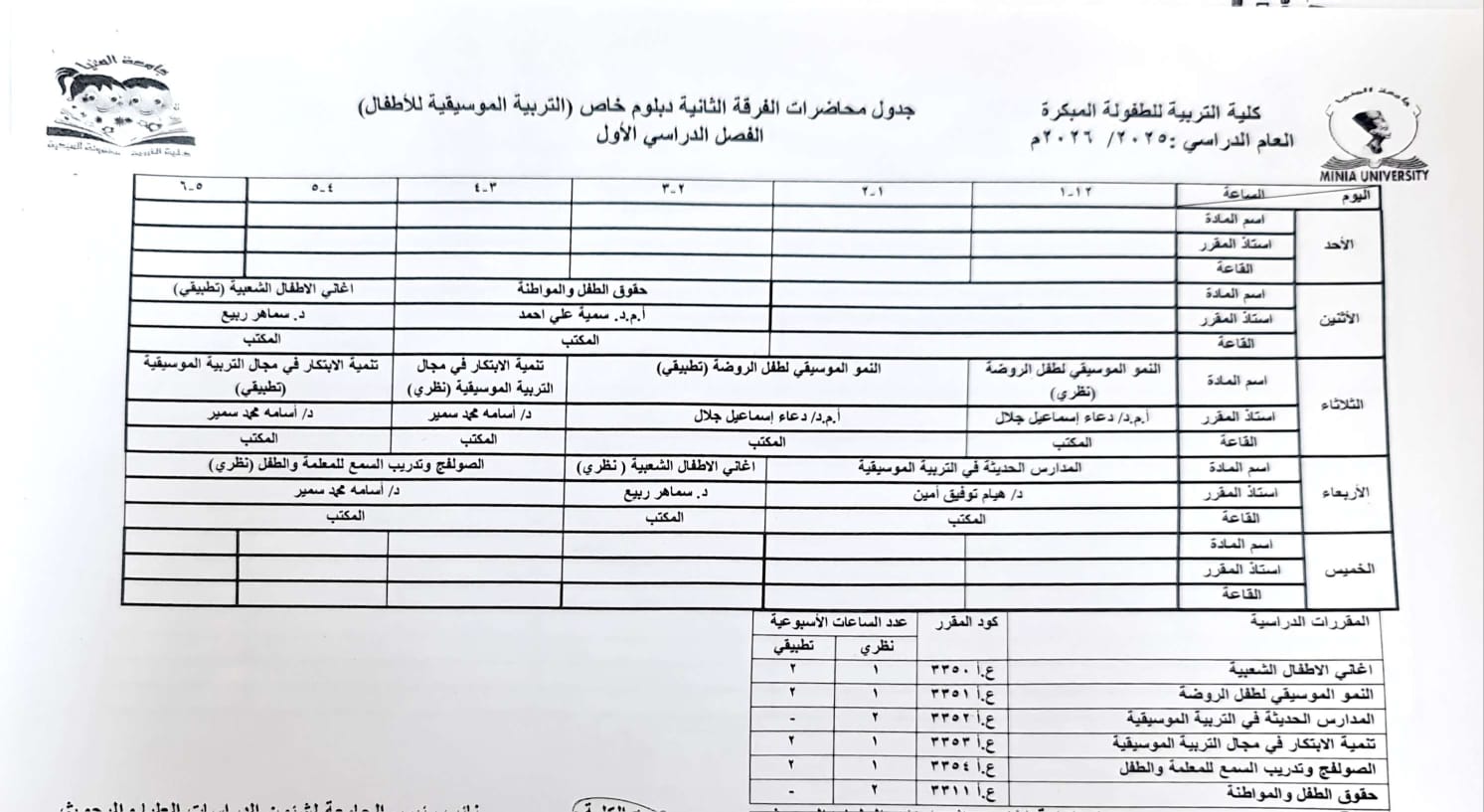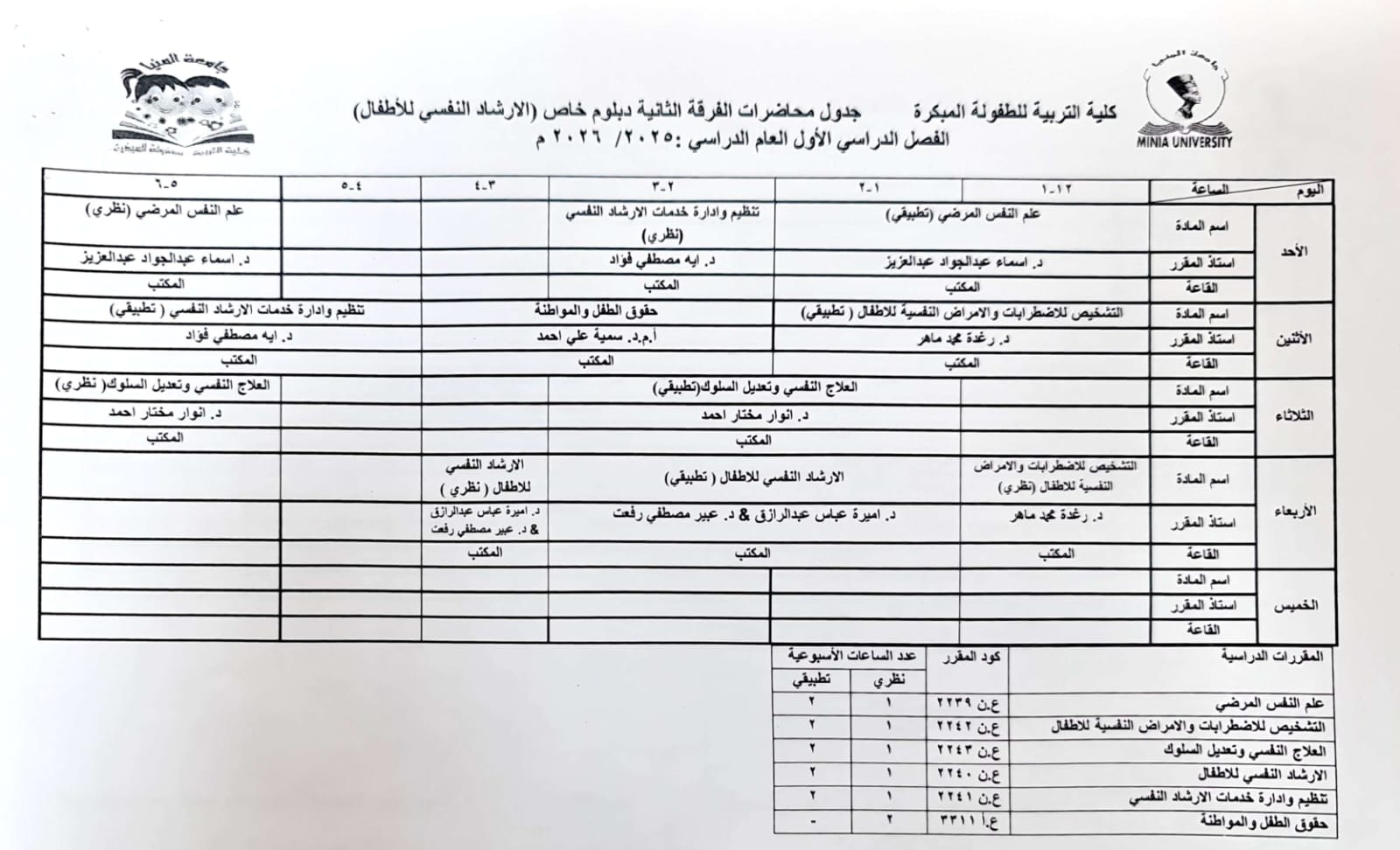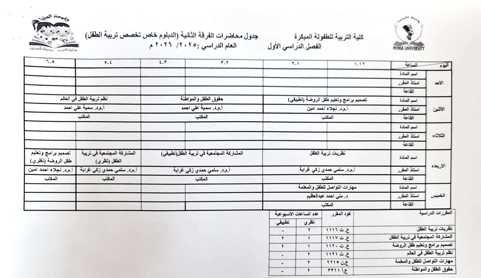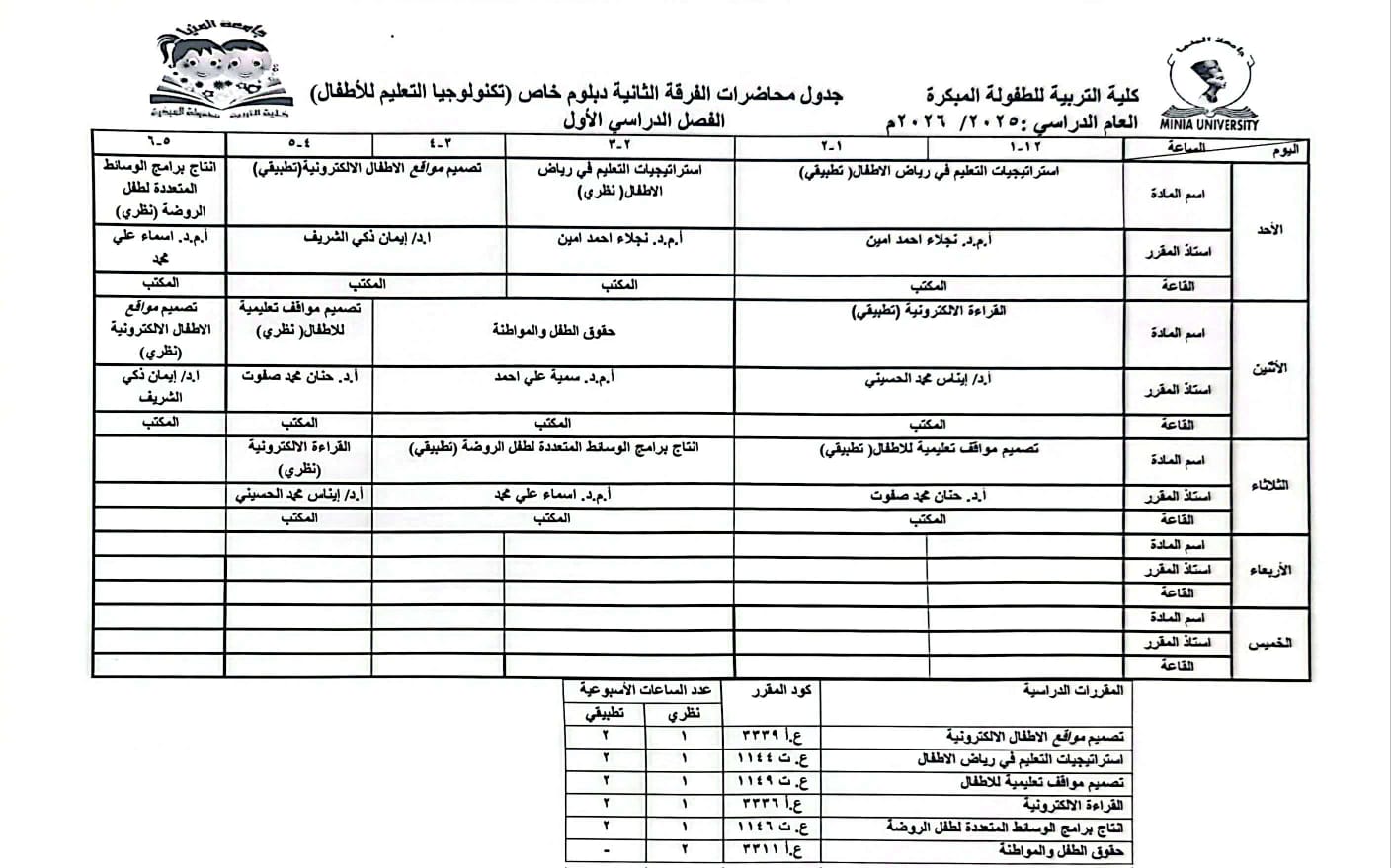 جداول الدراسية للفرقة الثانية للدبلوم الخاص( التربية - التربية الفنية - الارشاد النفسى للاطفال - التربية الموسيقية للاطفال - تربية الطفل - تكنولوجيا التعليم للاطفال )