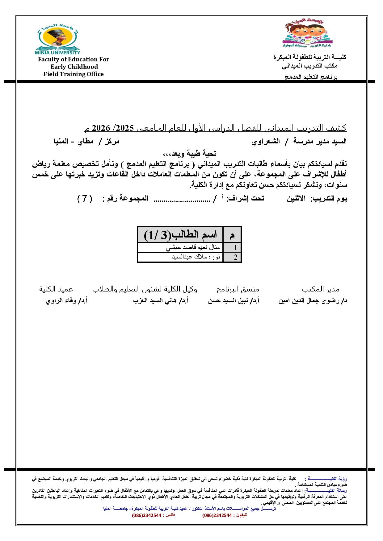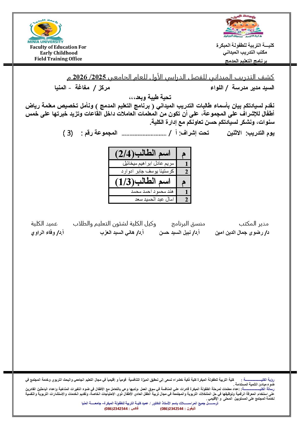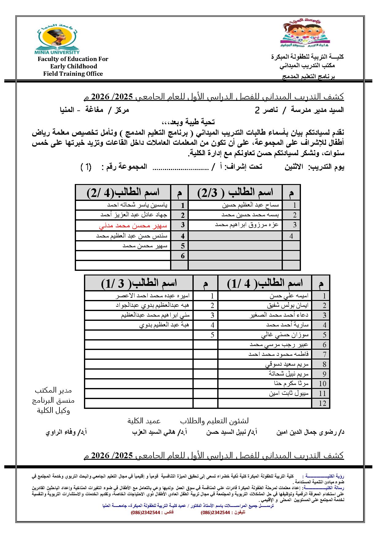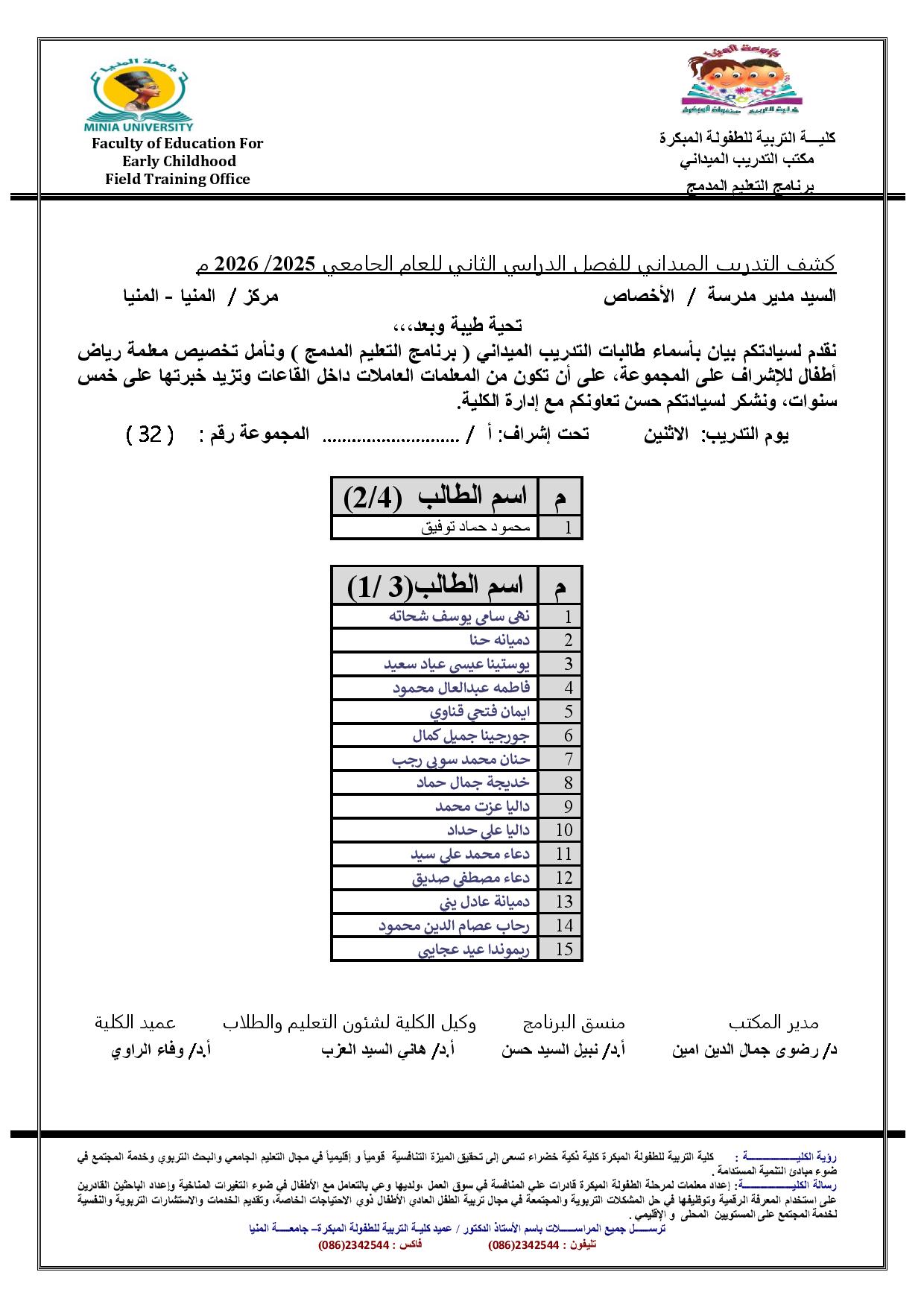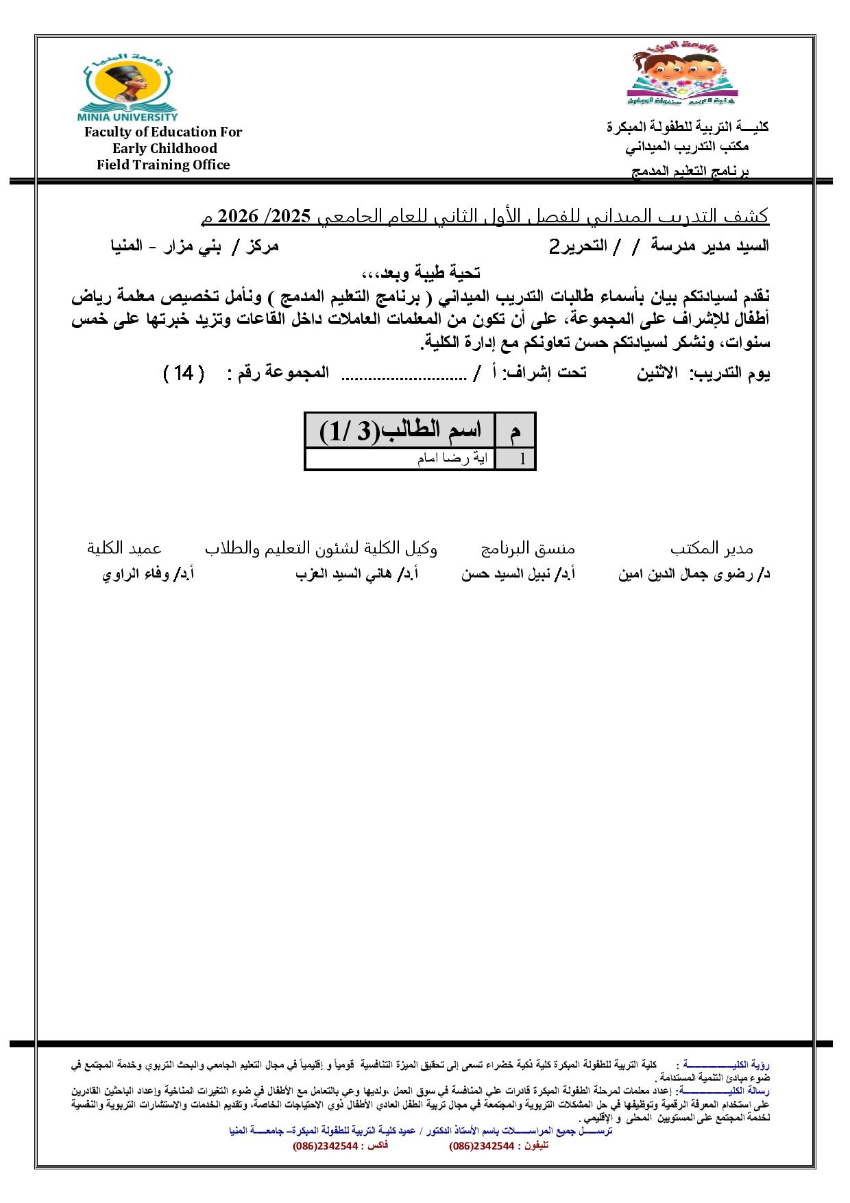 بيان باسماء طالبات التدريب الميدانى ( برنامج التعليم المدمج ) لعام جامعى 2026/2025
