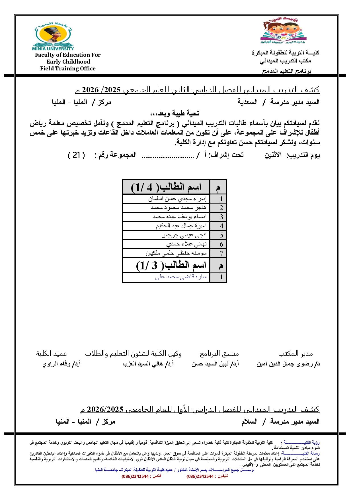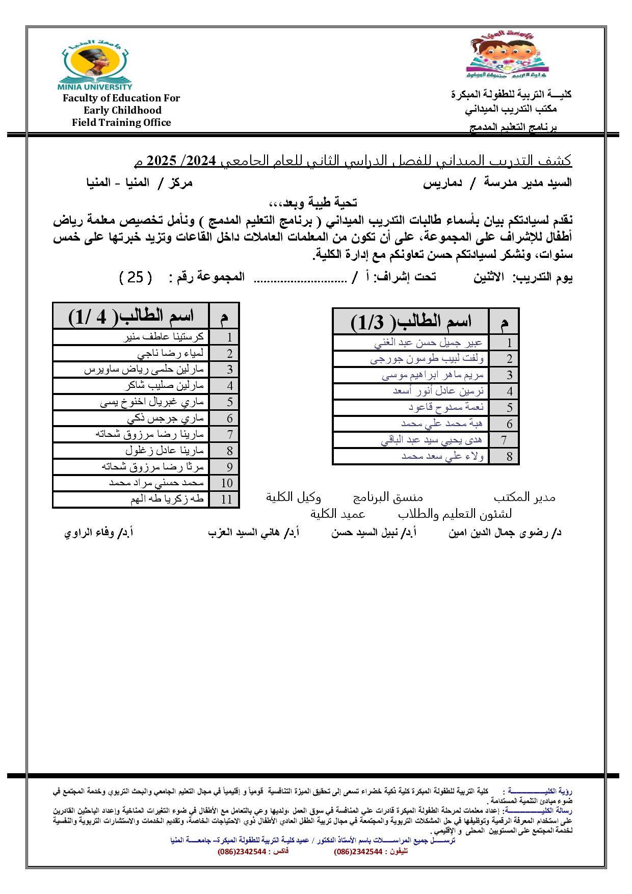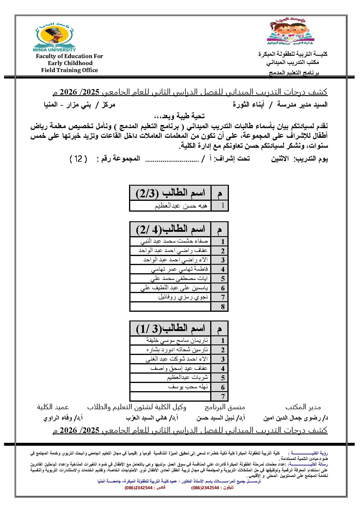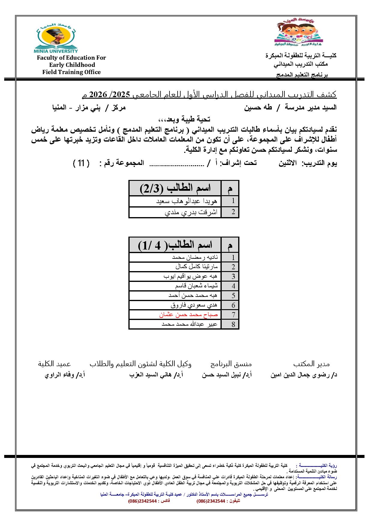 بيان باسماء طالبات التدريب الميدانى ( برنامج التعليم المدمج ) لعام جامعى 2026/2025