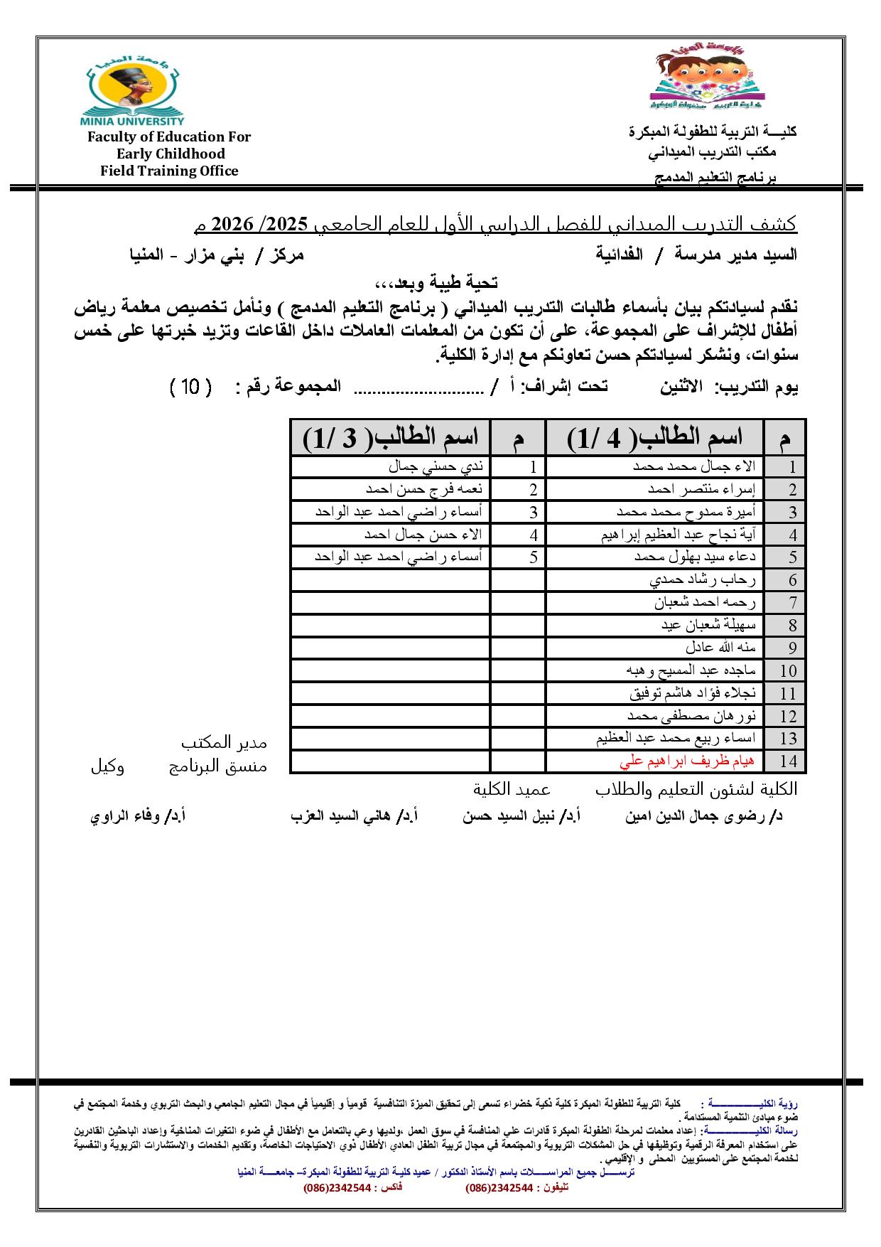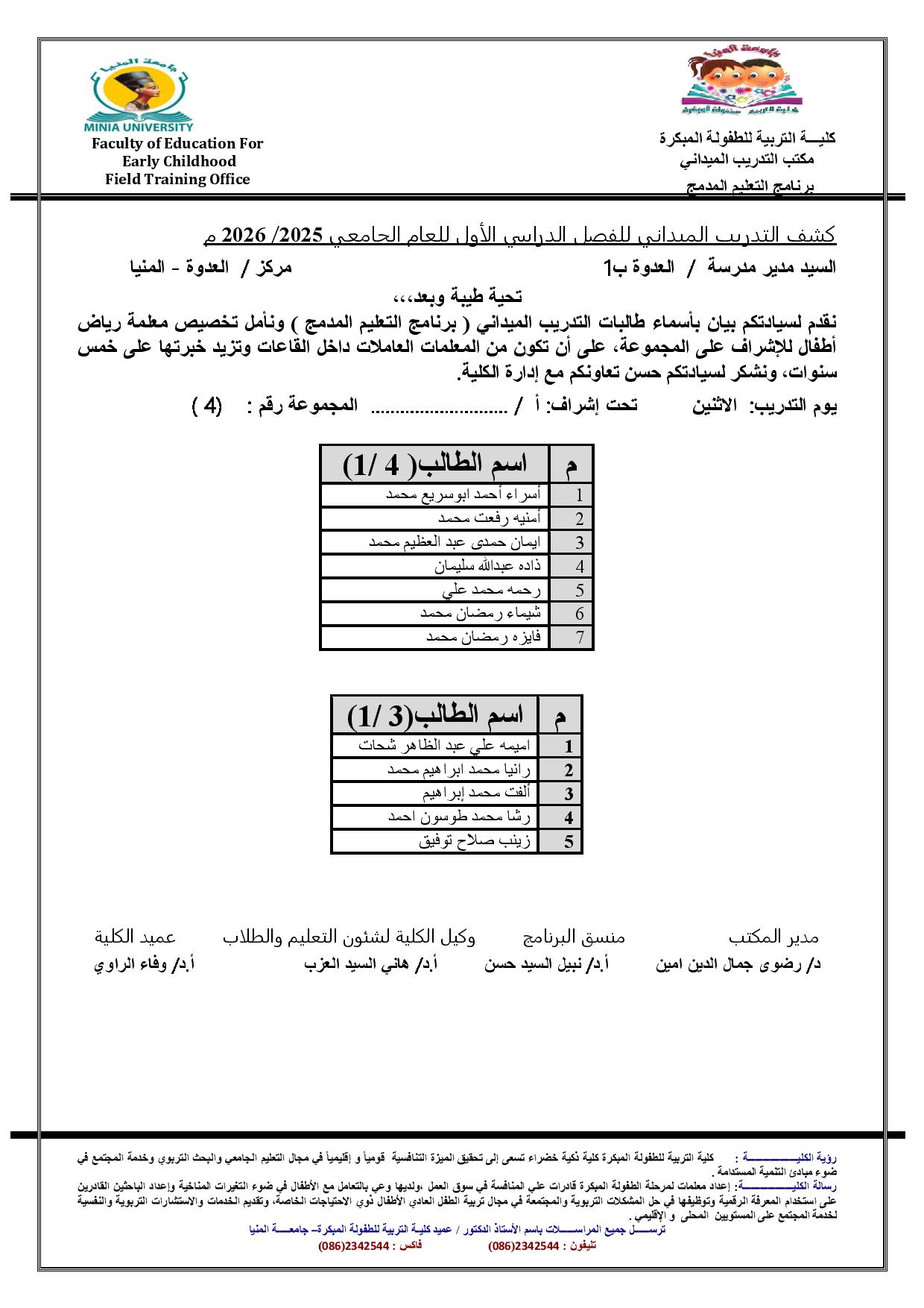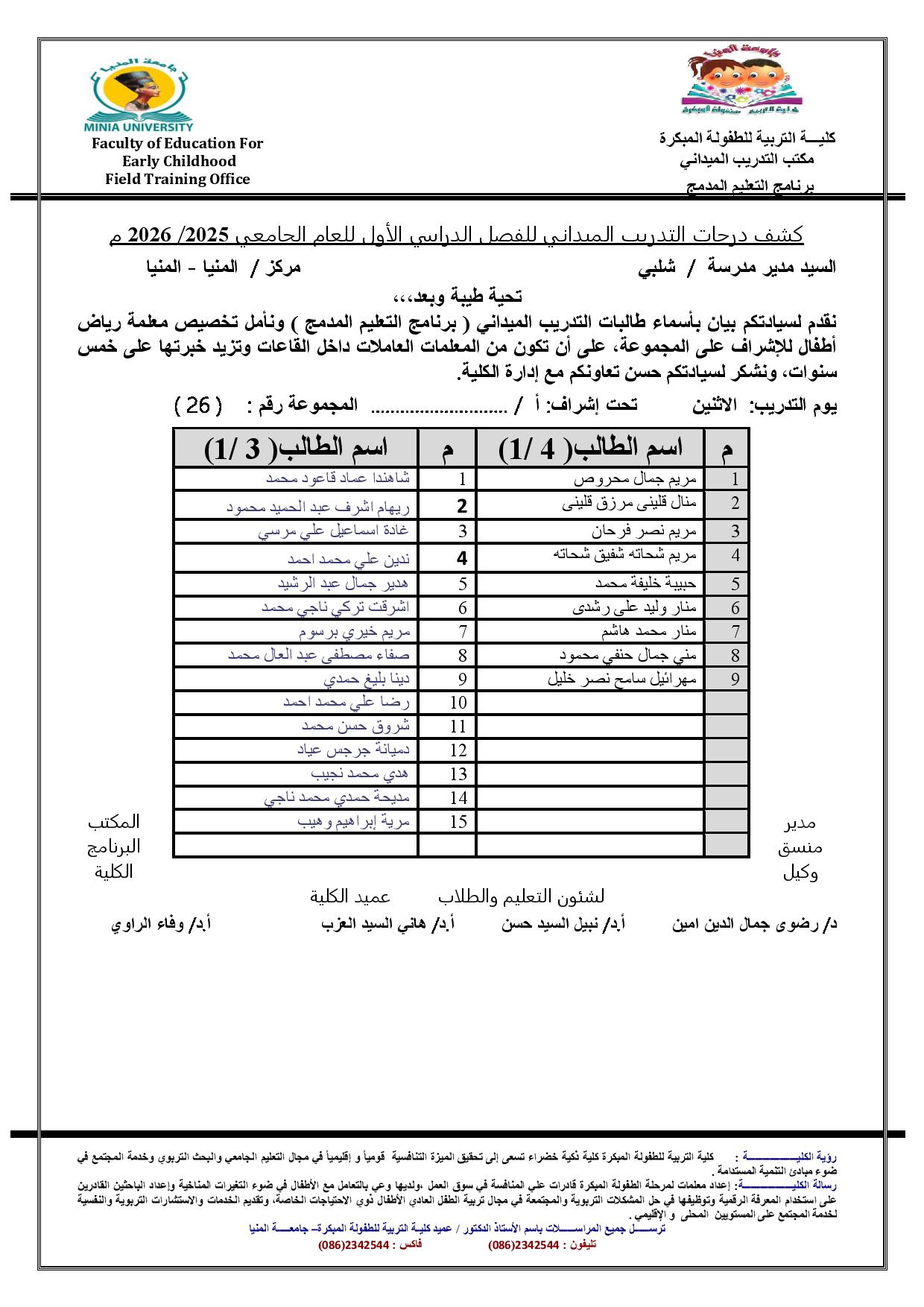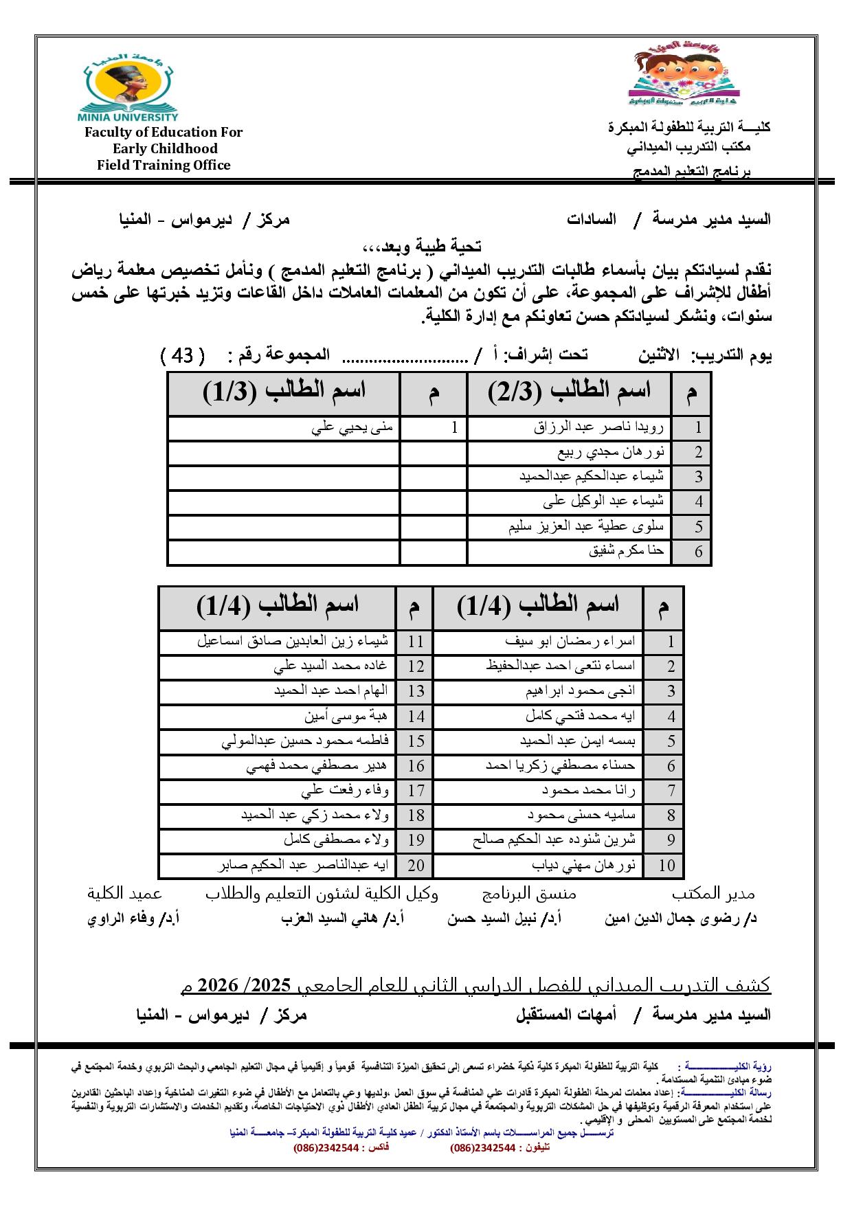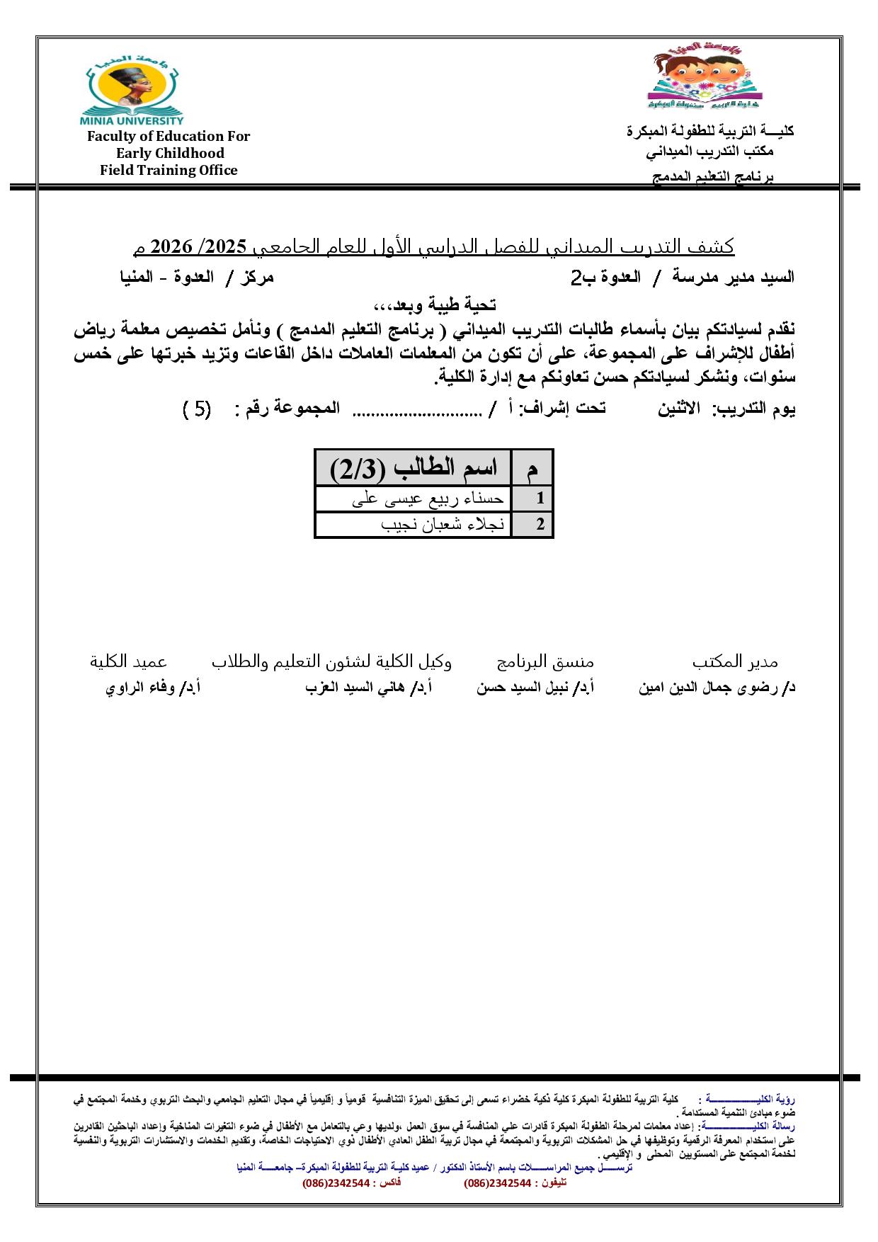 بيان باسماء طالبات التدريب الميدانى ( برنامج التعليم المدمج ) لعام جامعى 2026/2025