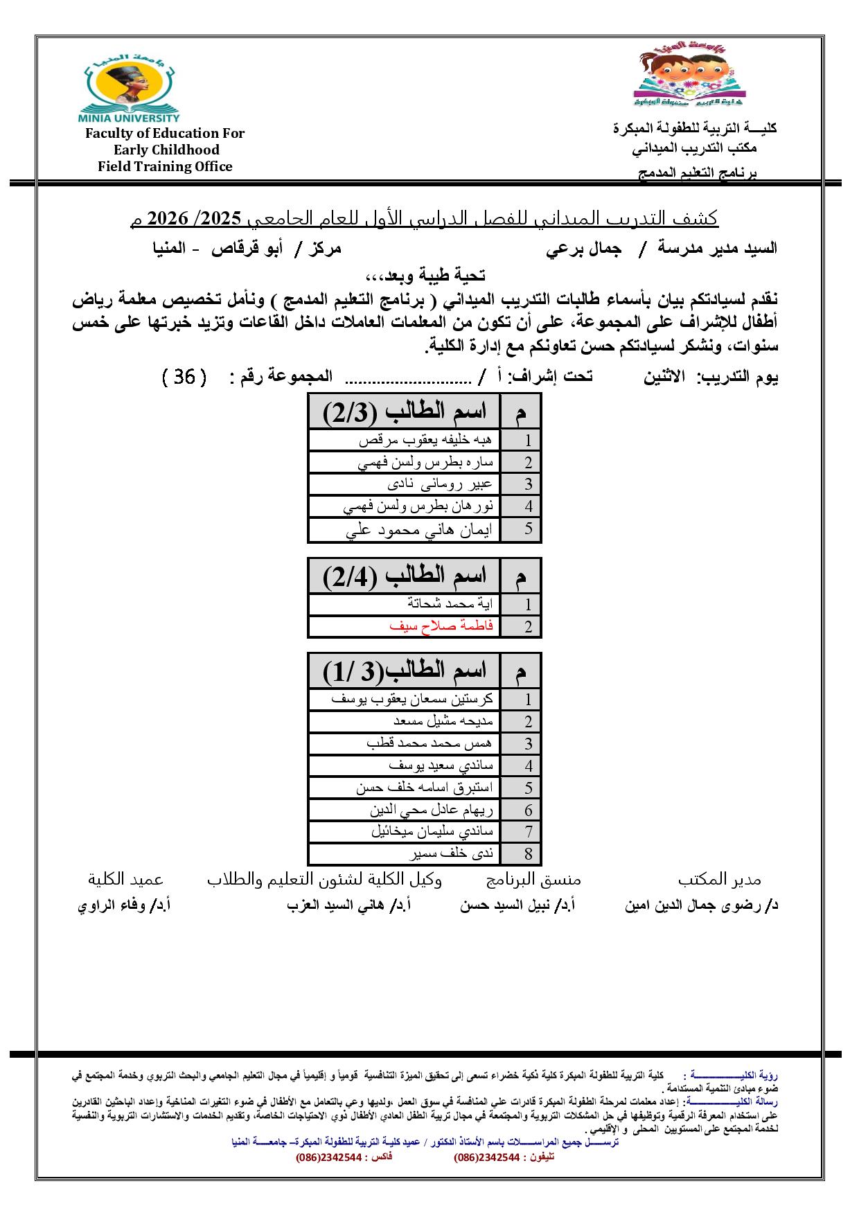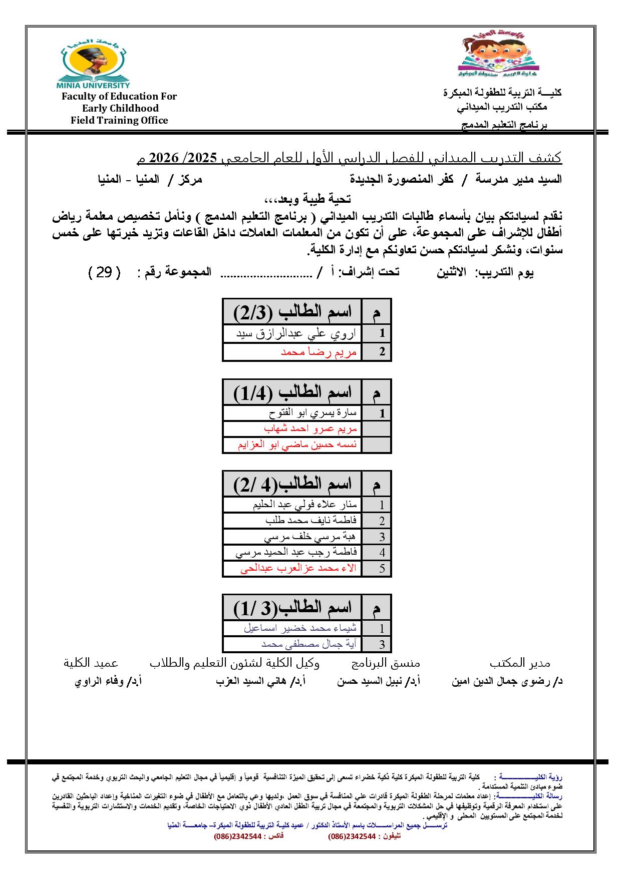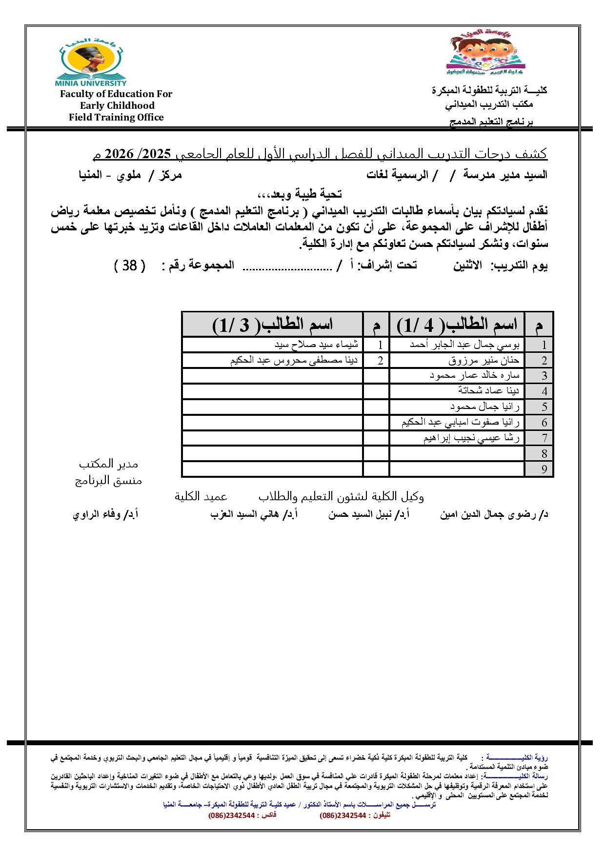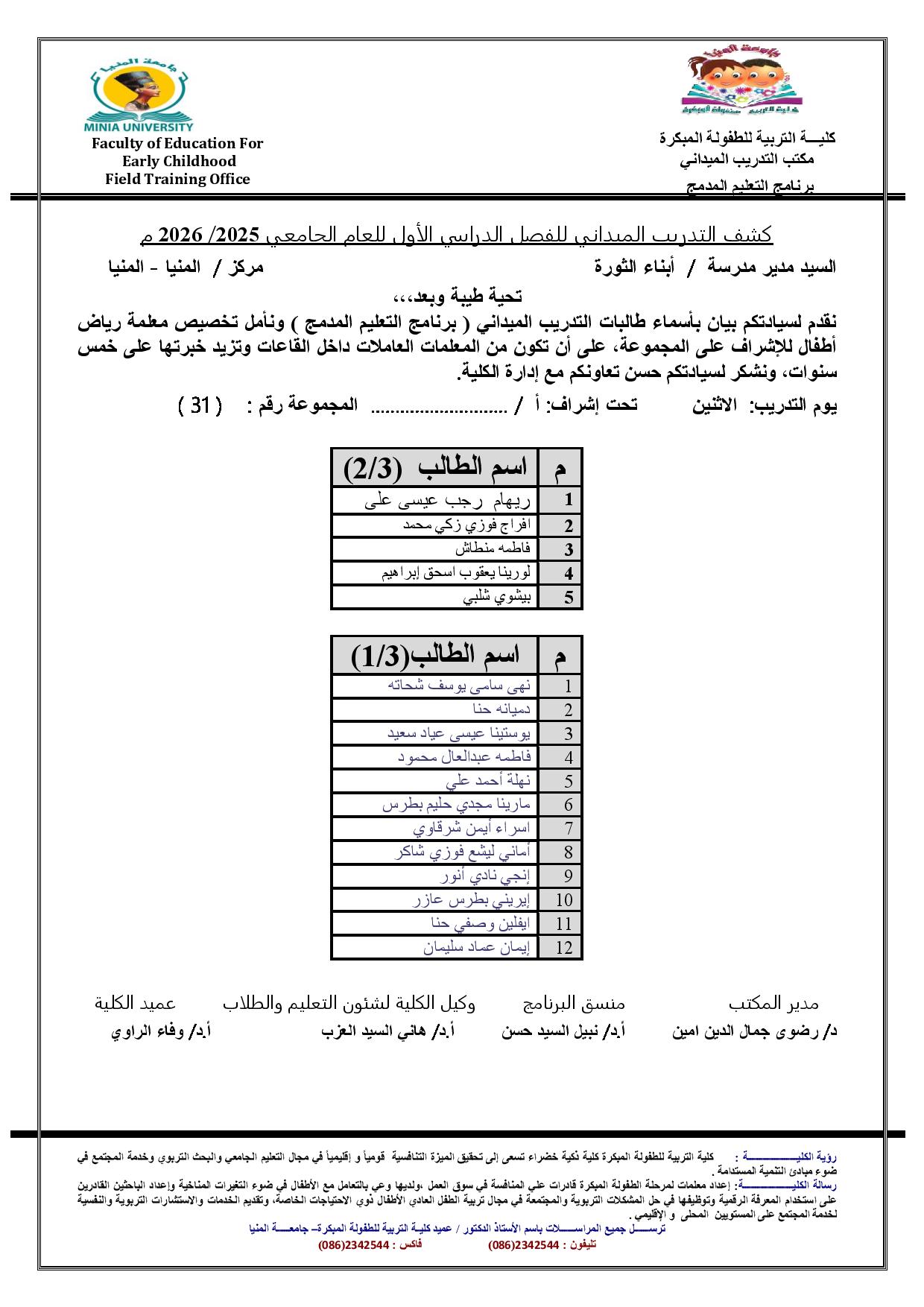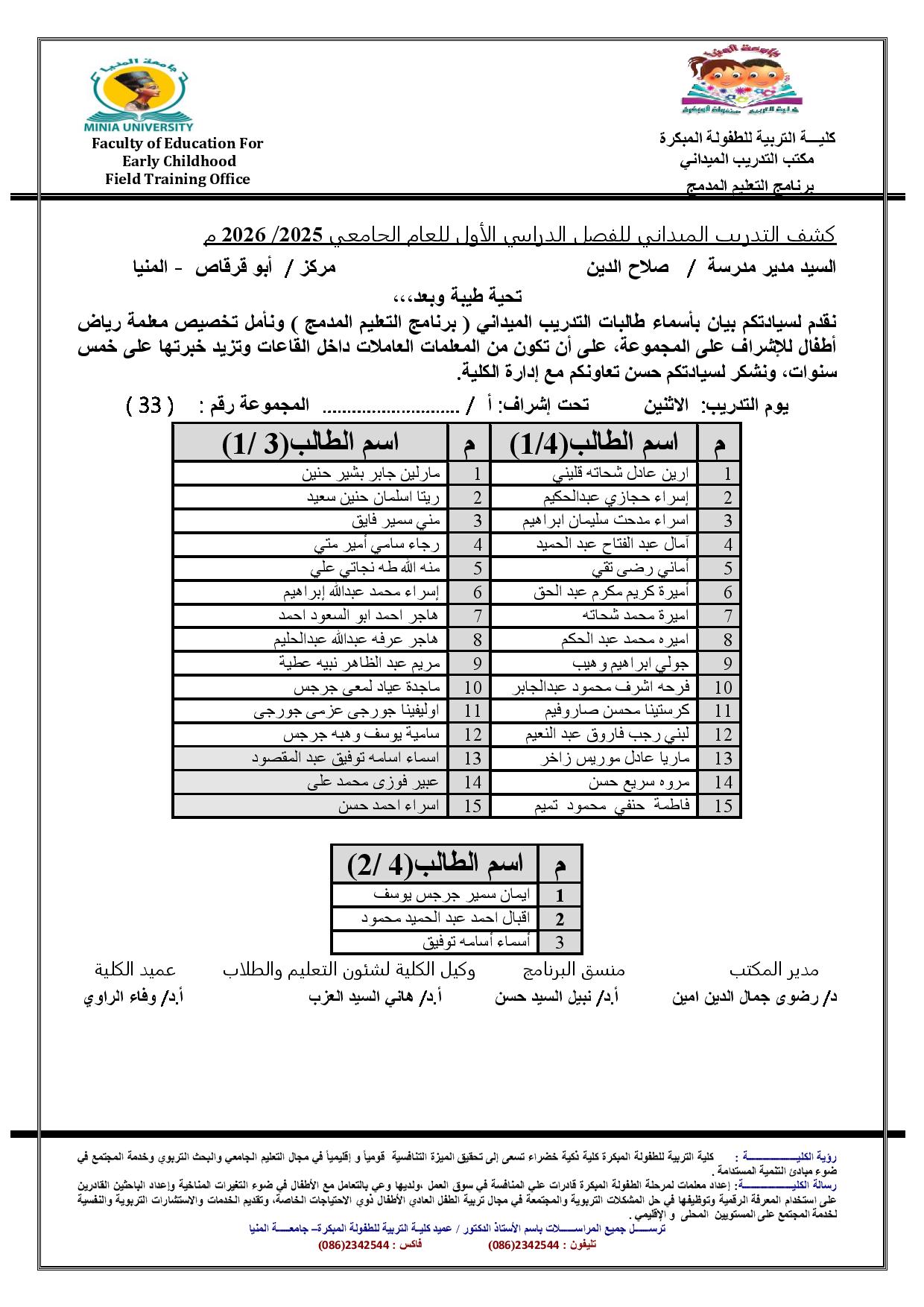 بيان باسماء طالبات التدريب الميدانى ( برنامج التعليم المدمج ) لعام جامعى 2026/2025