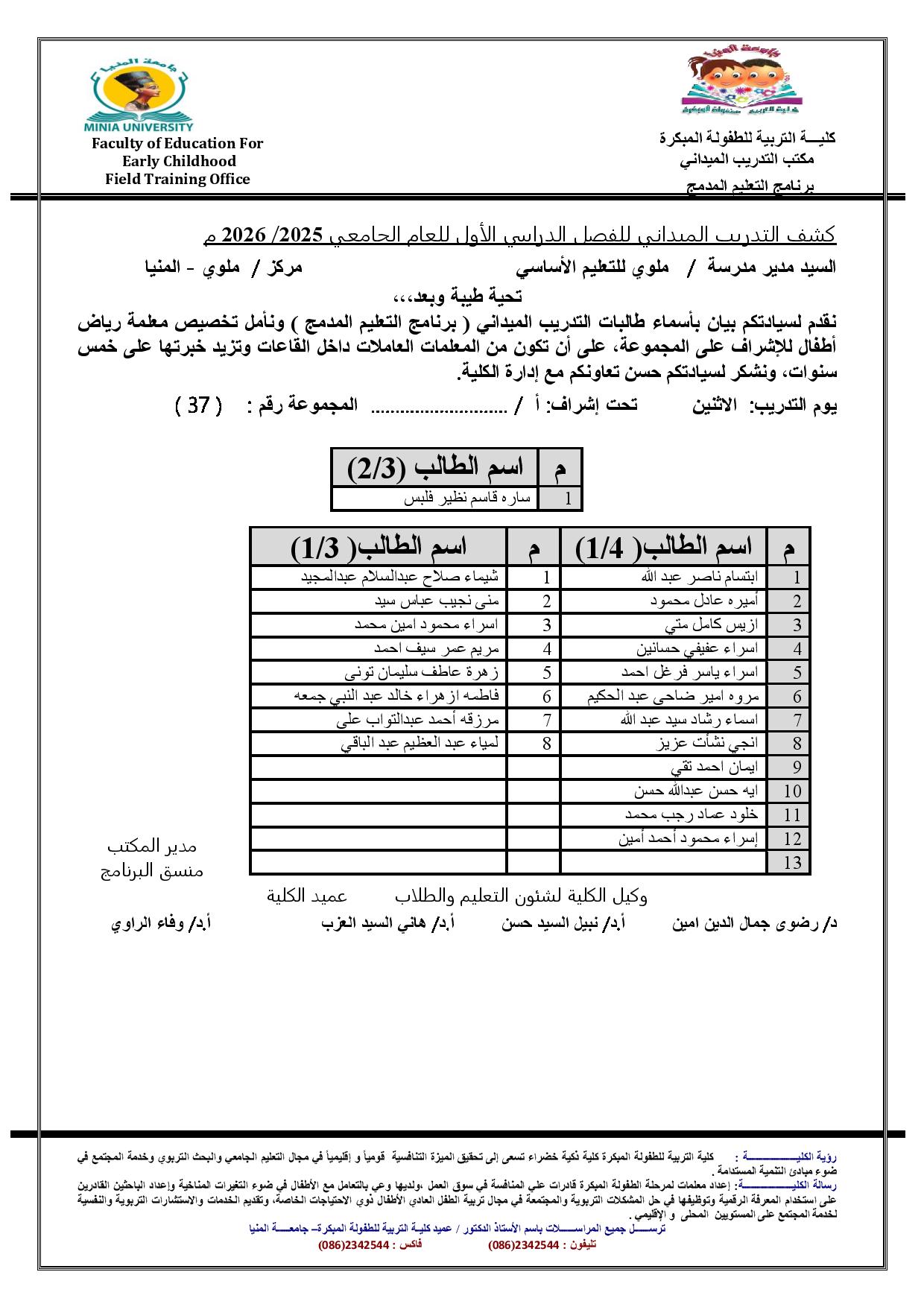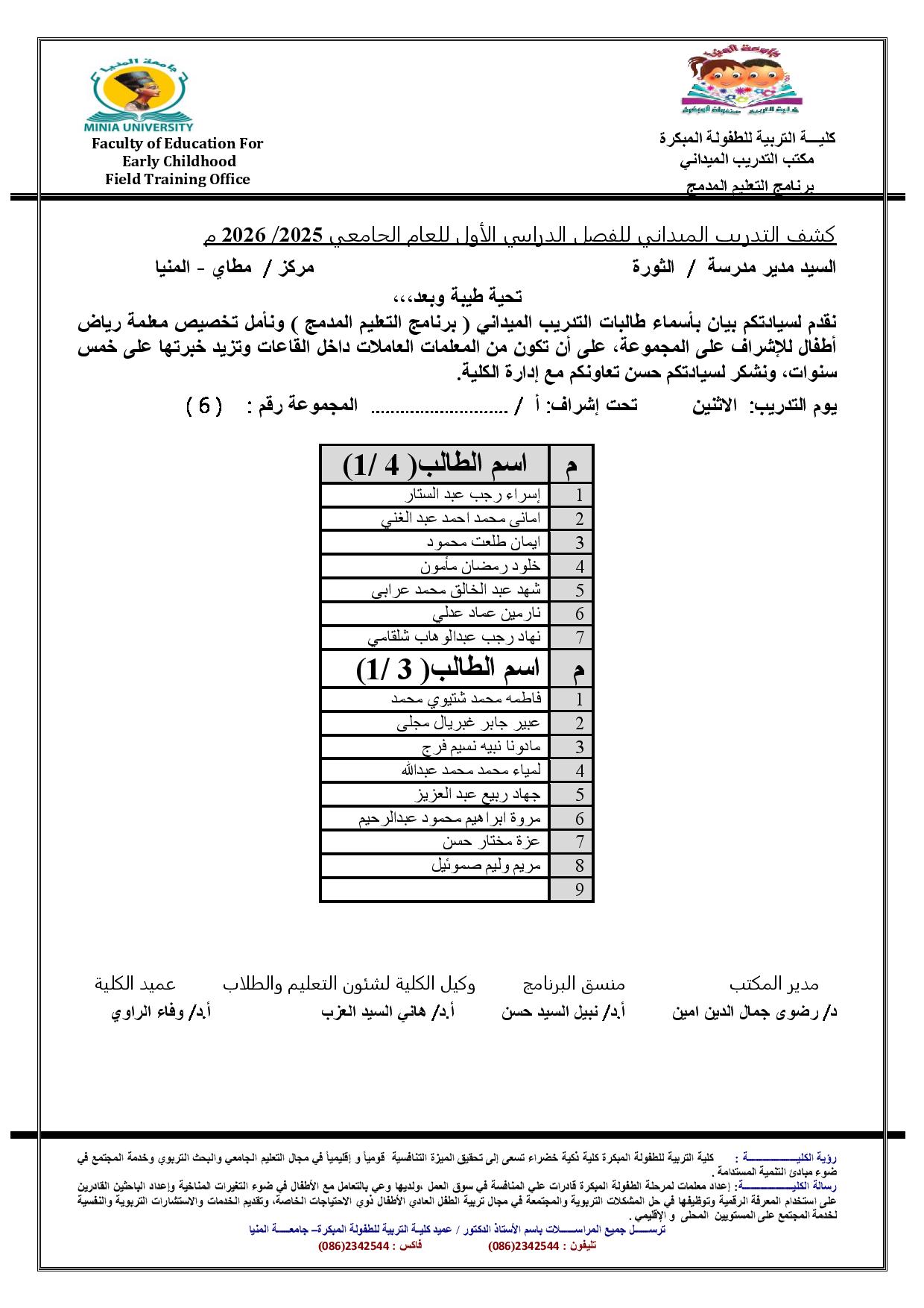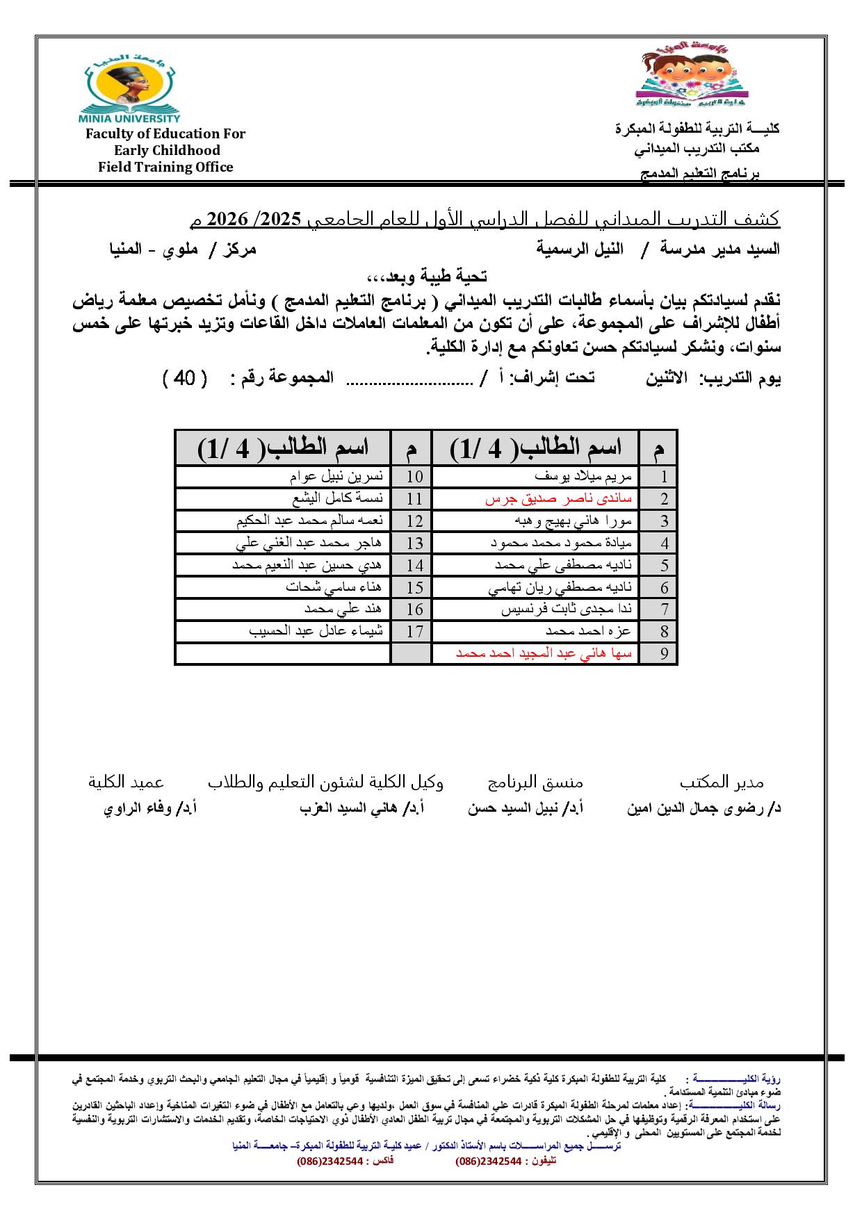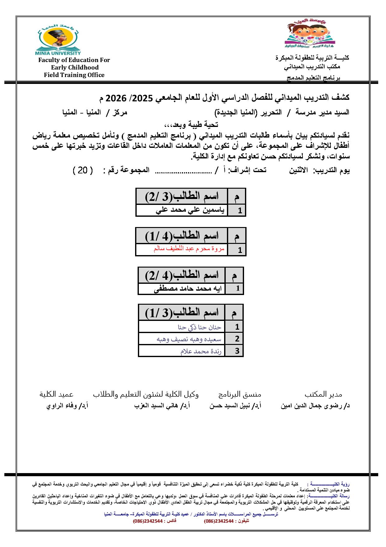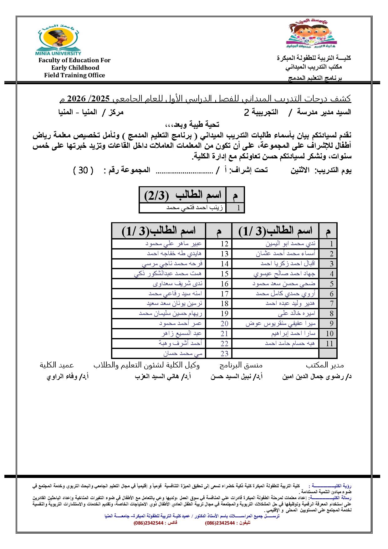 بيان باسماء طالبات التدريب الميدانى ( برنامج التعليم المدمج ) لعام جامعى 2026/2025