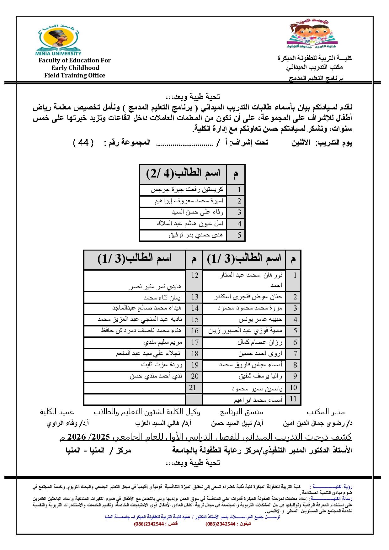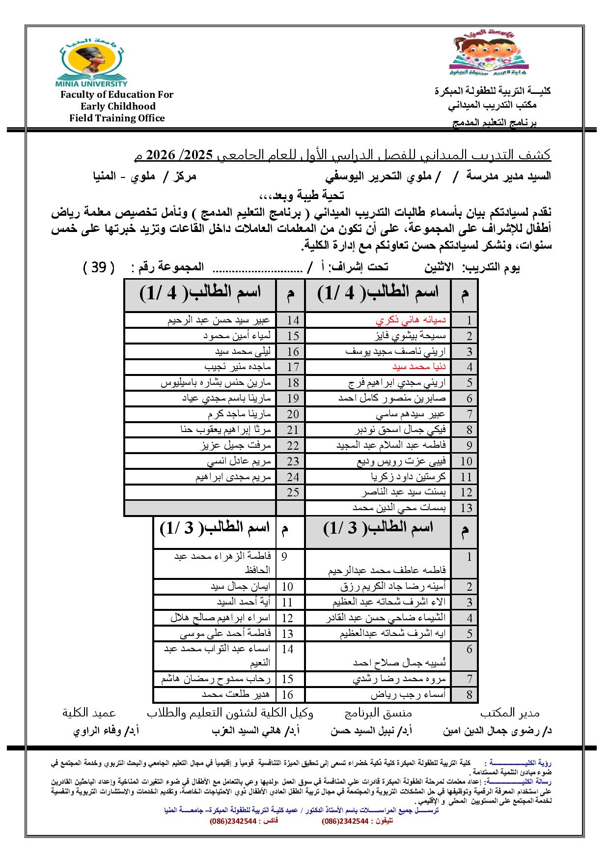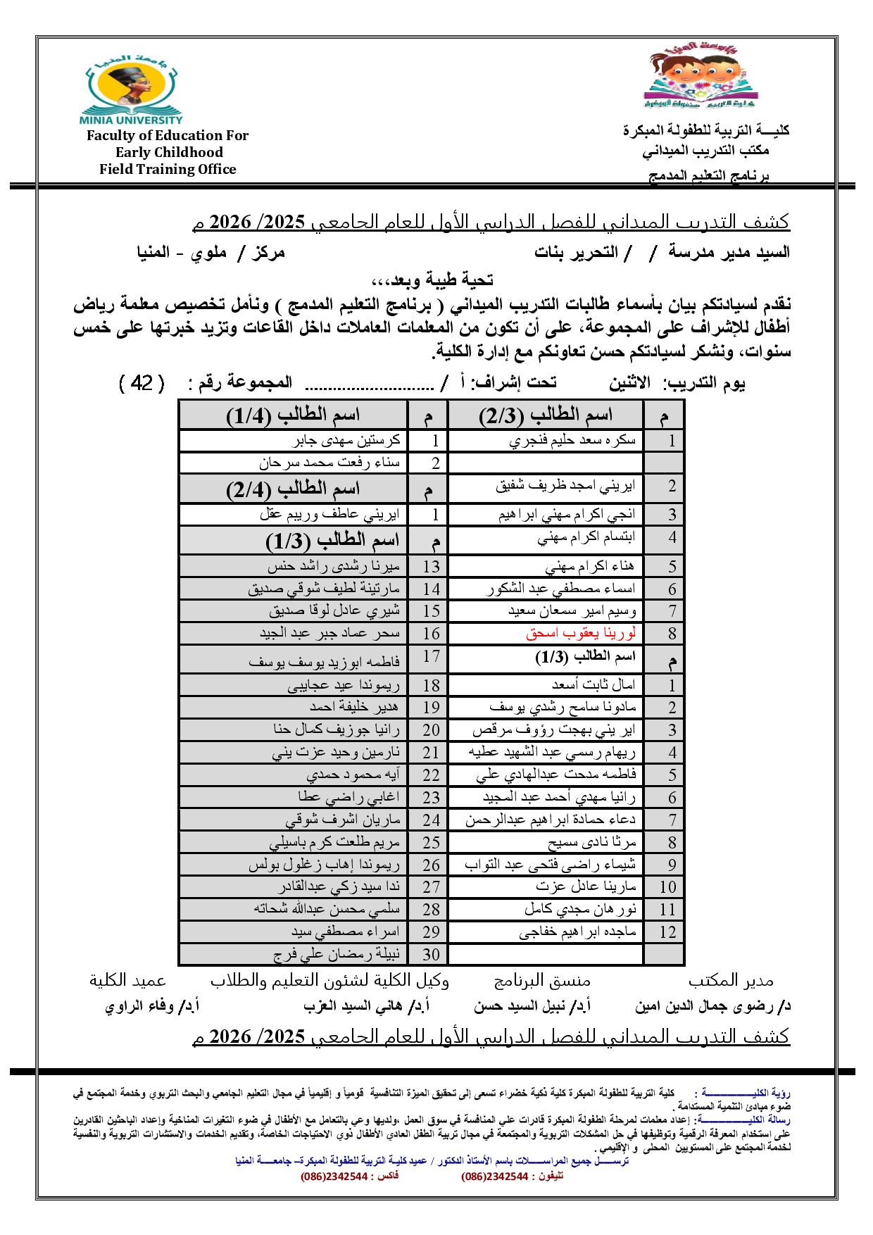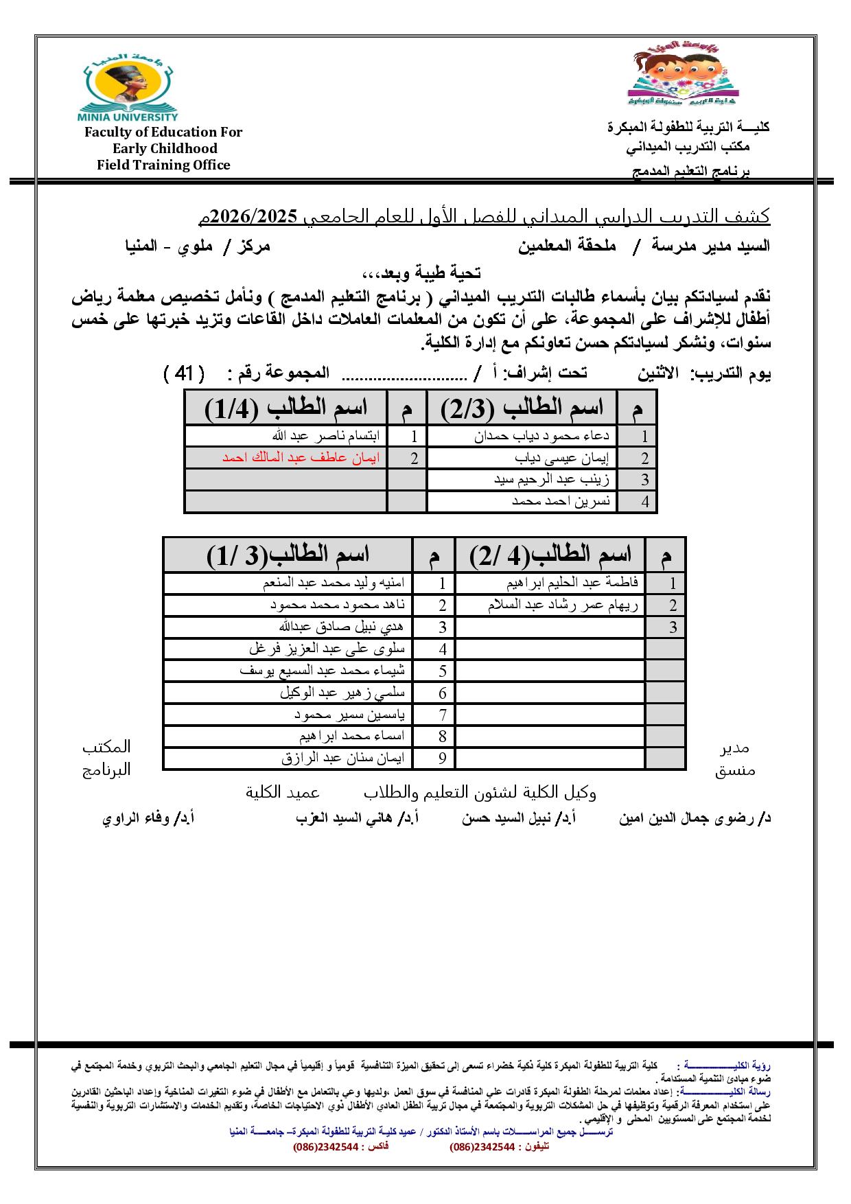بيان باسماء طالبات التدريب الميدانى ( برنامج التعليم المدمج ) لعام جامعى 2026/2025