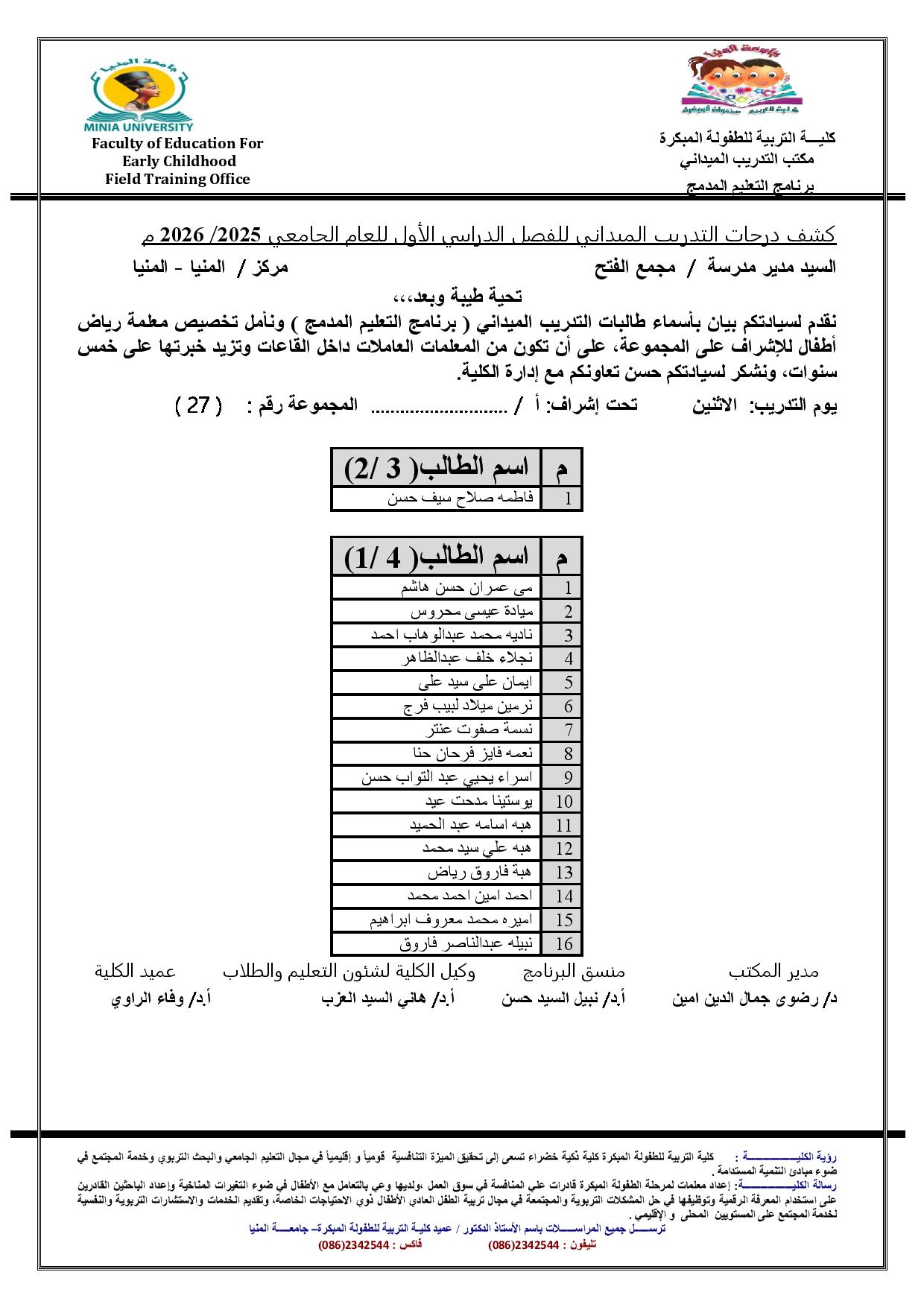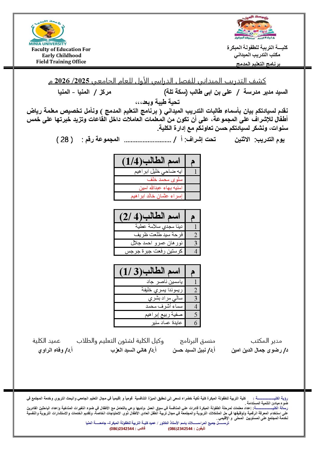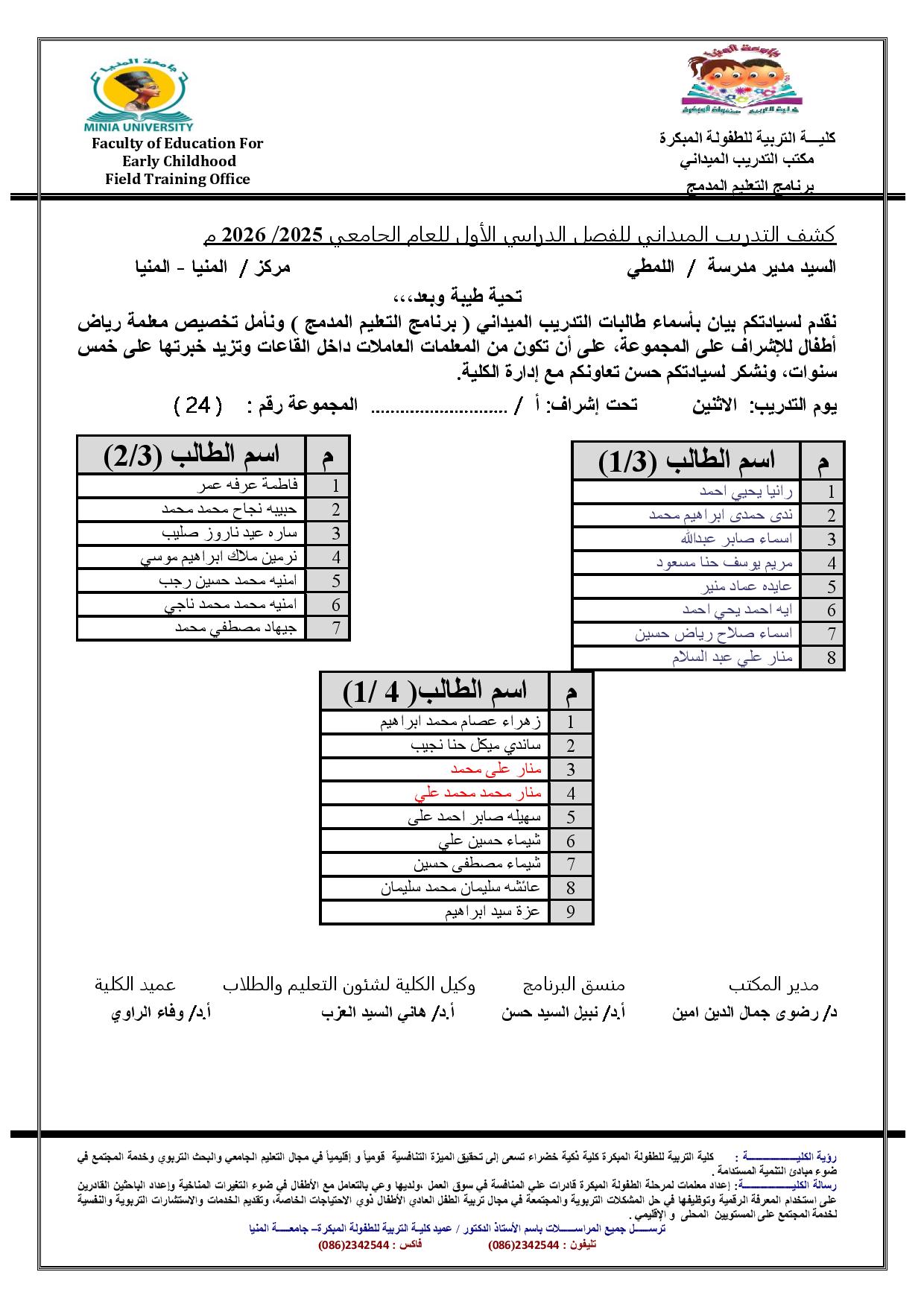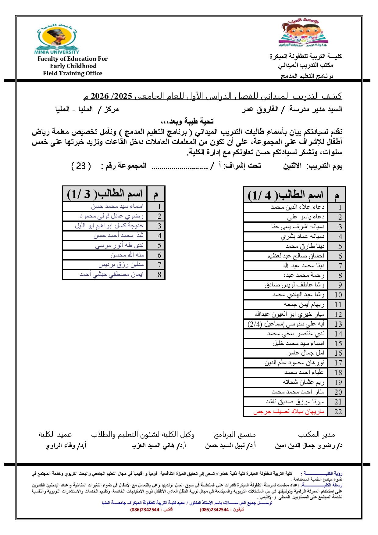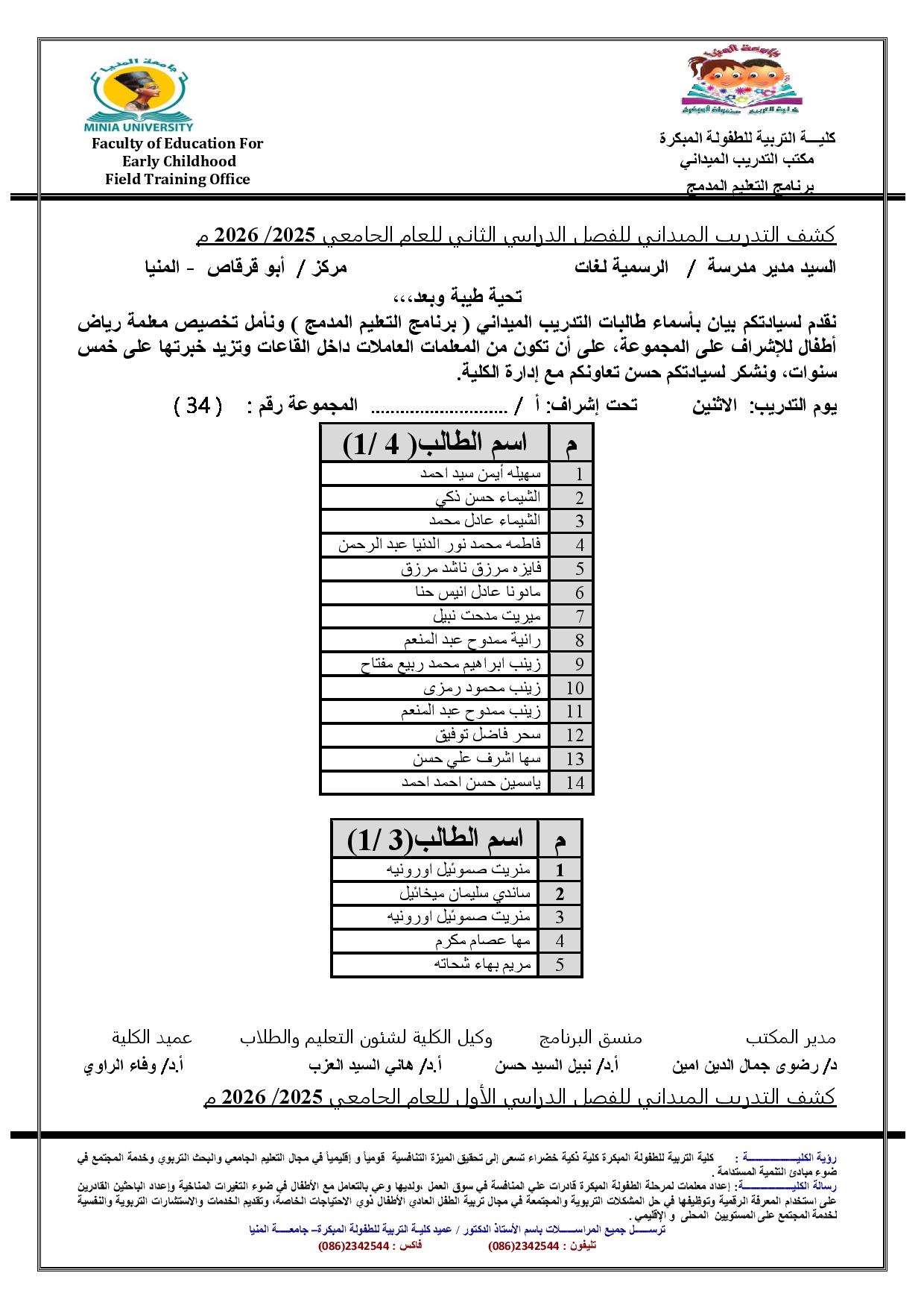 بيان باسماء طالبات التدريب الميدانى ( برنامج التعليم المدمج ) لعام جامعى 2026/2025