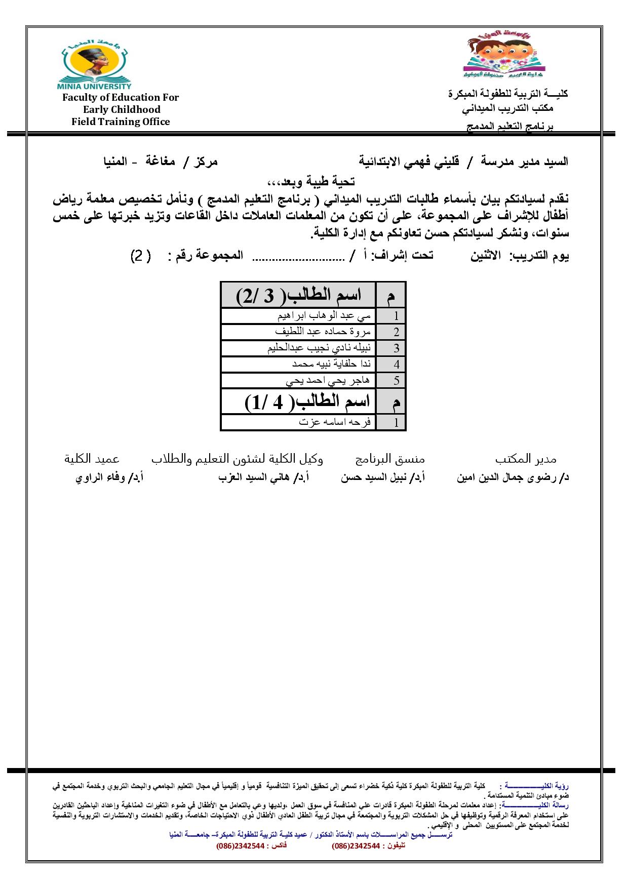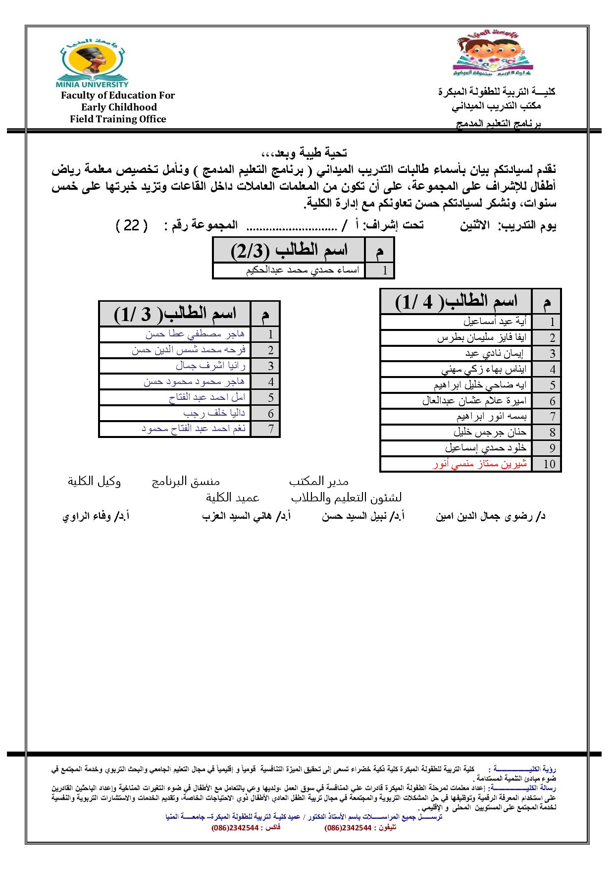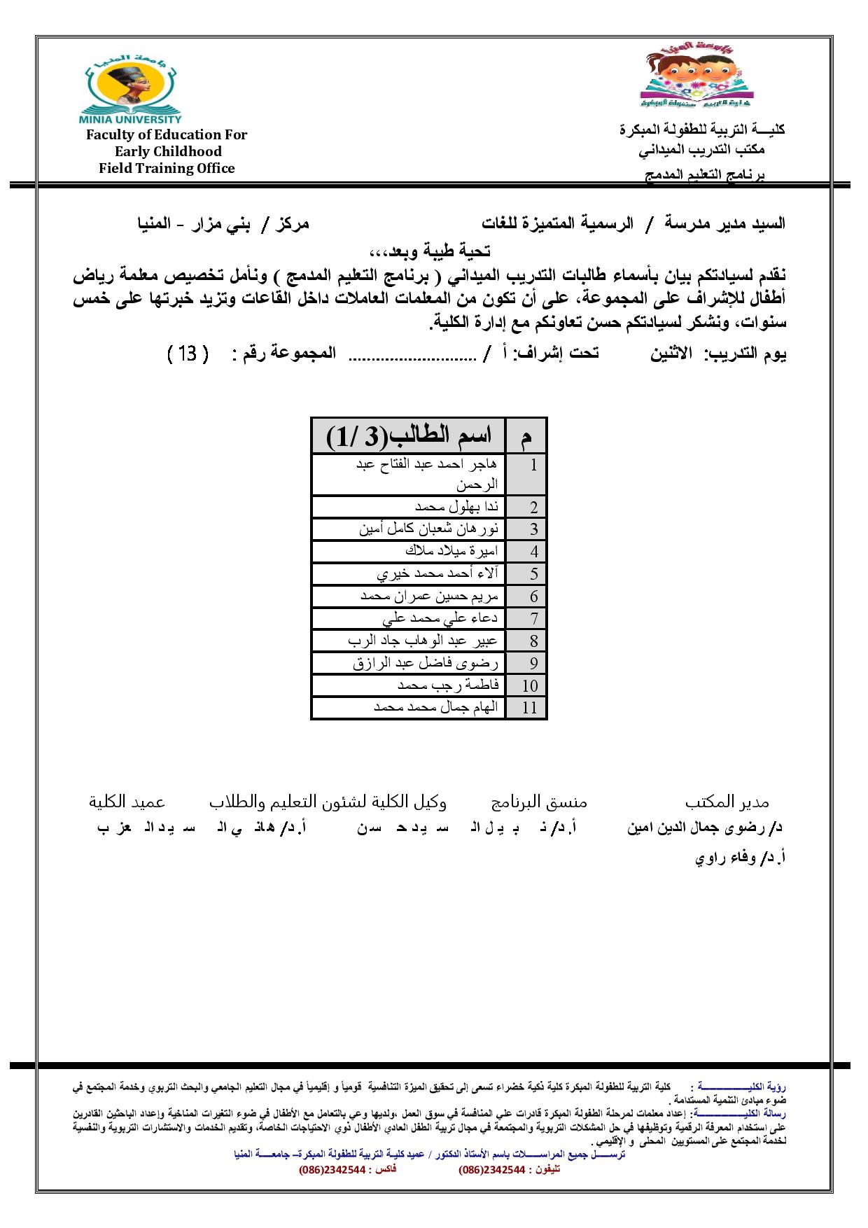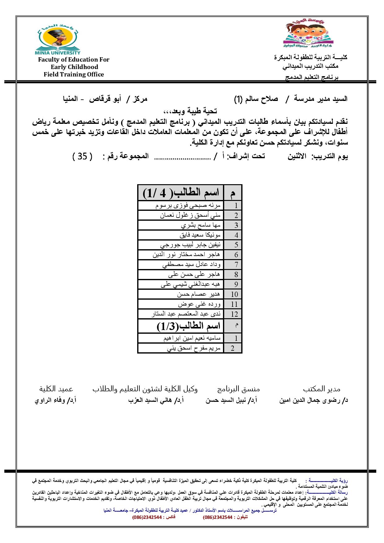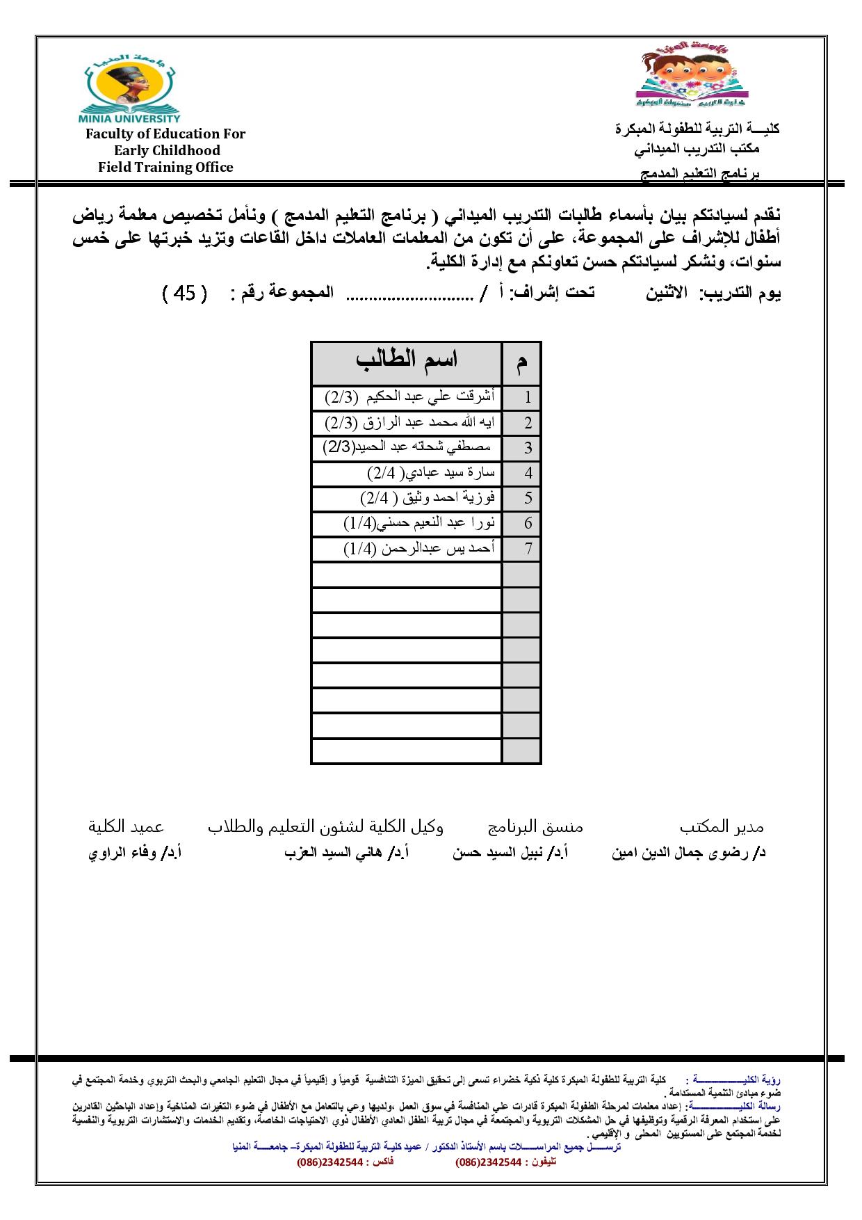 بيان باسماء طالبات التدريب الميدانى ( برنامج التعليم المدمج ) لعام جامعى 2026/2025