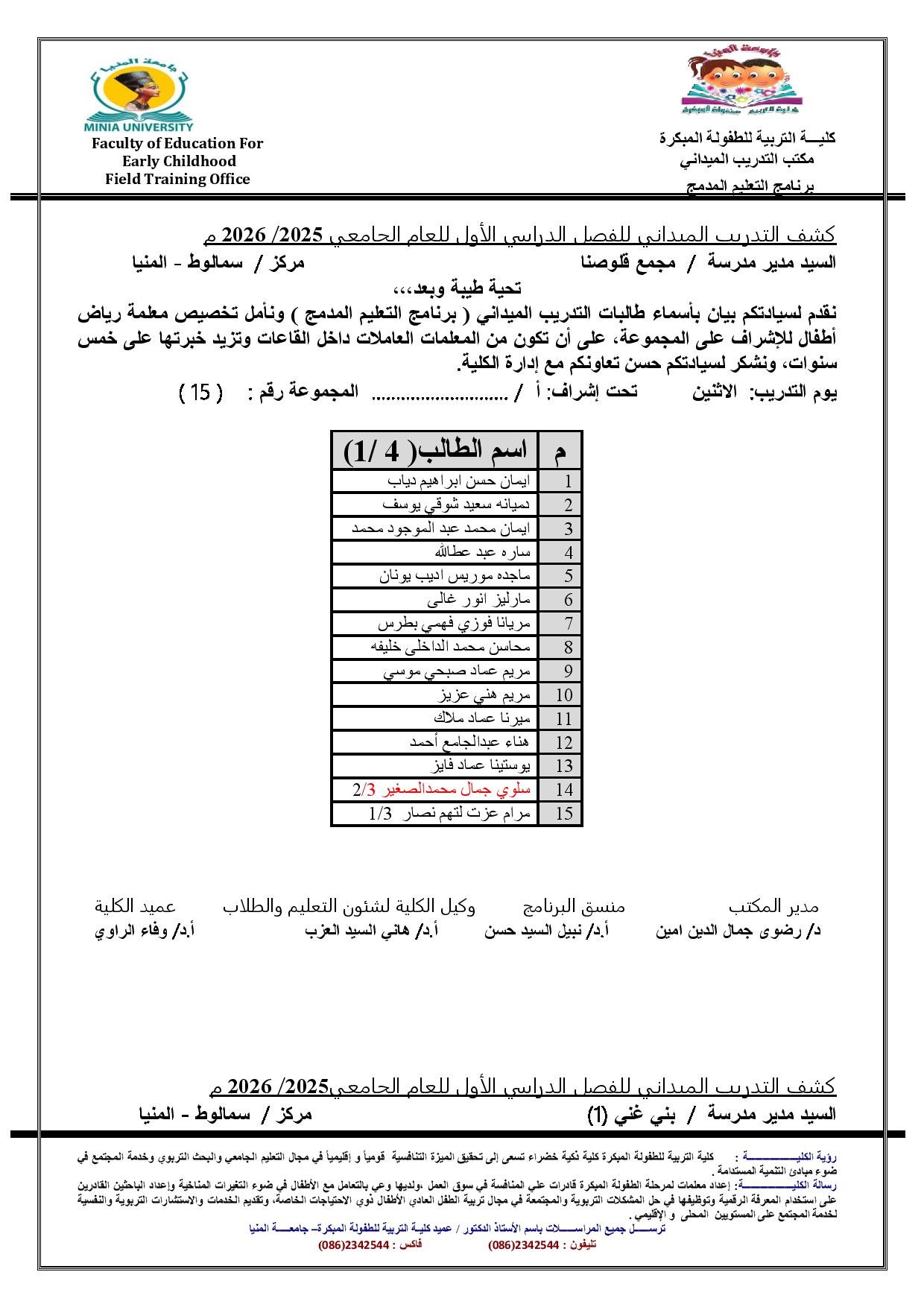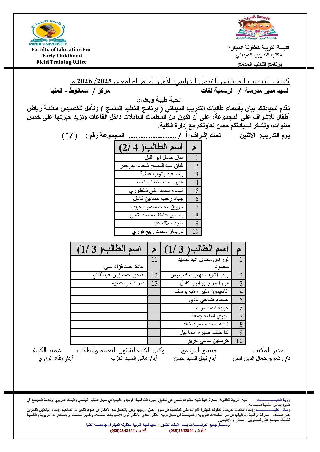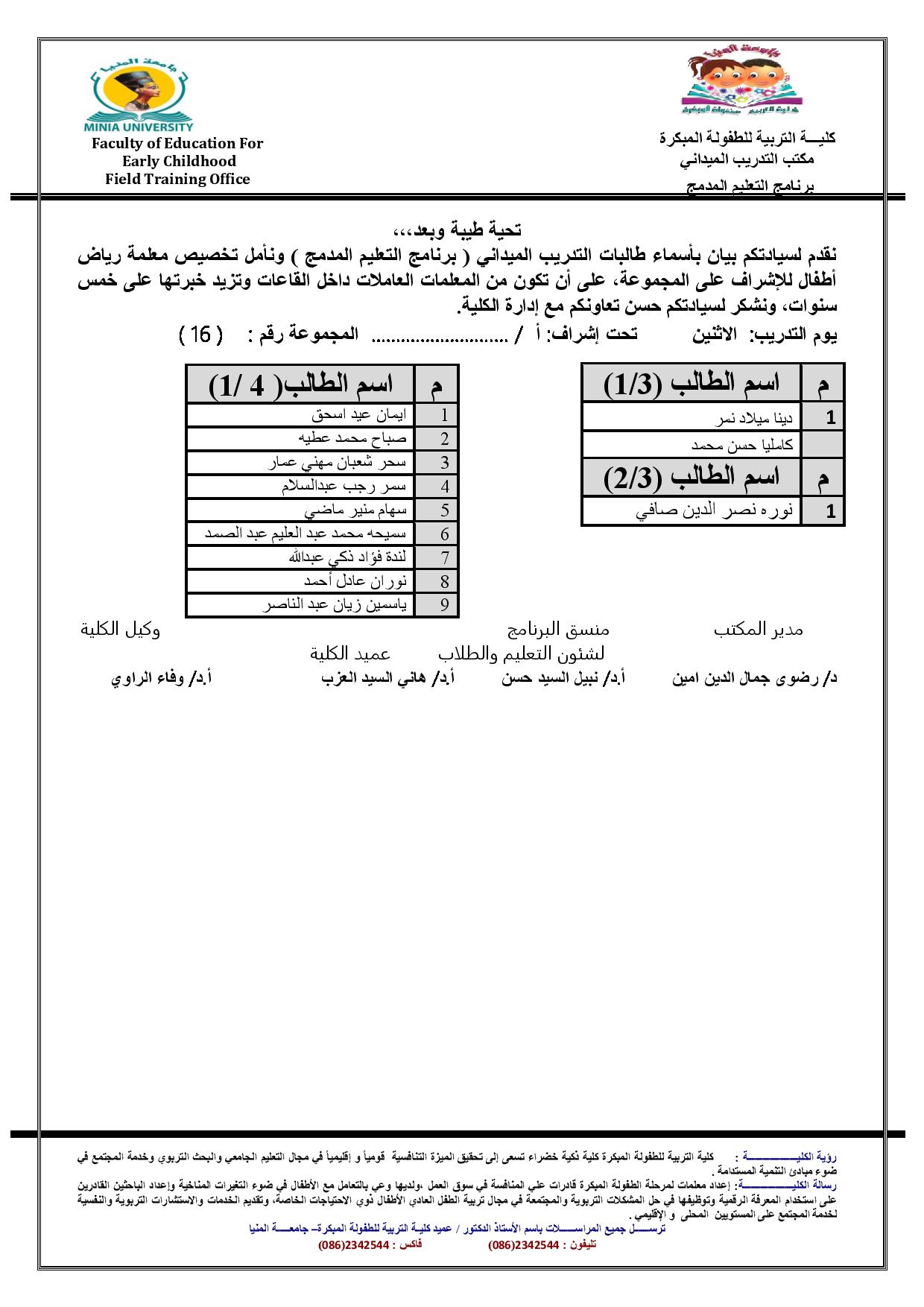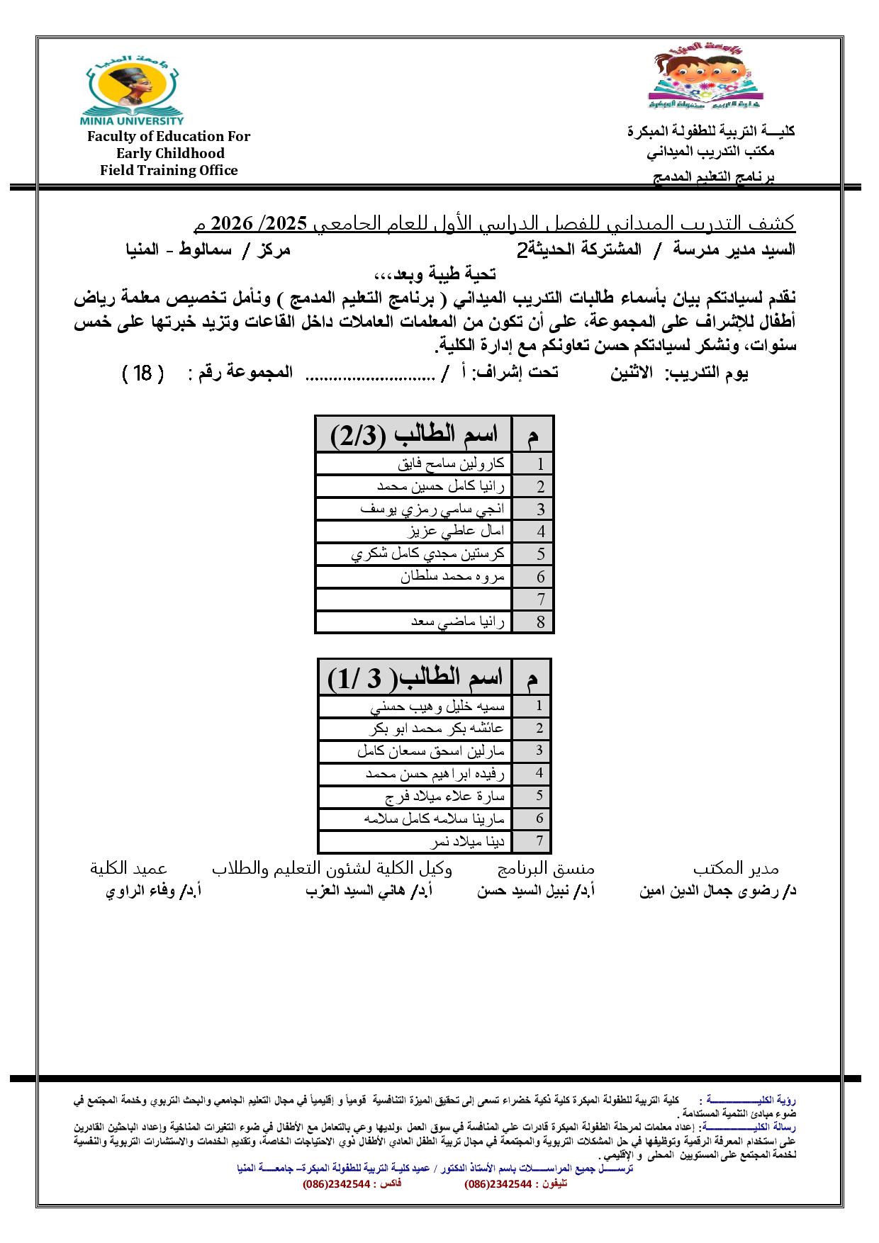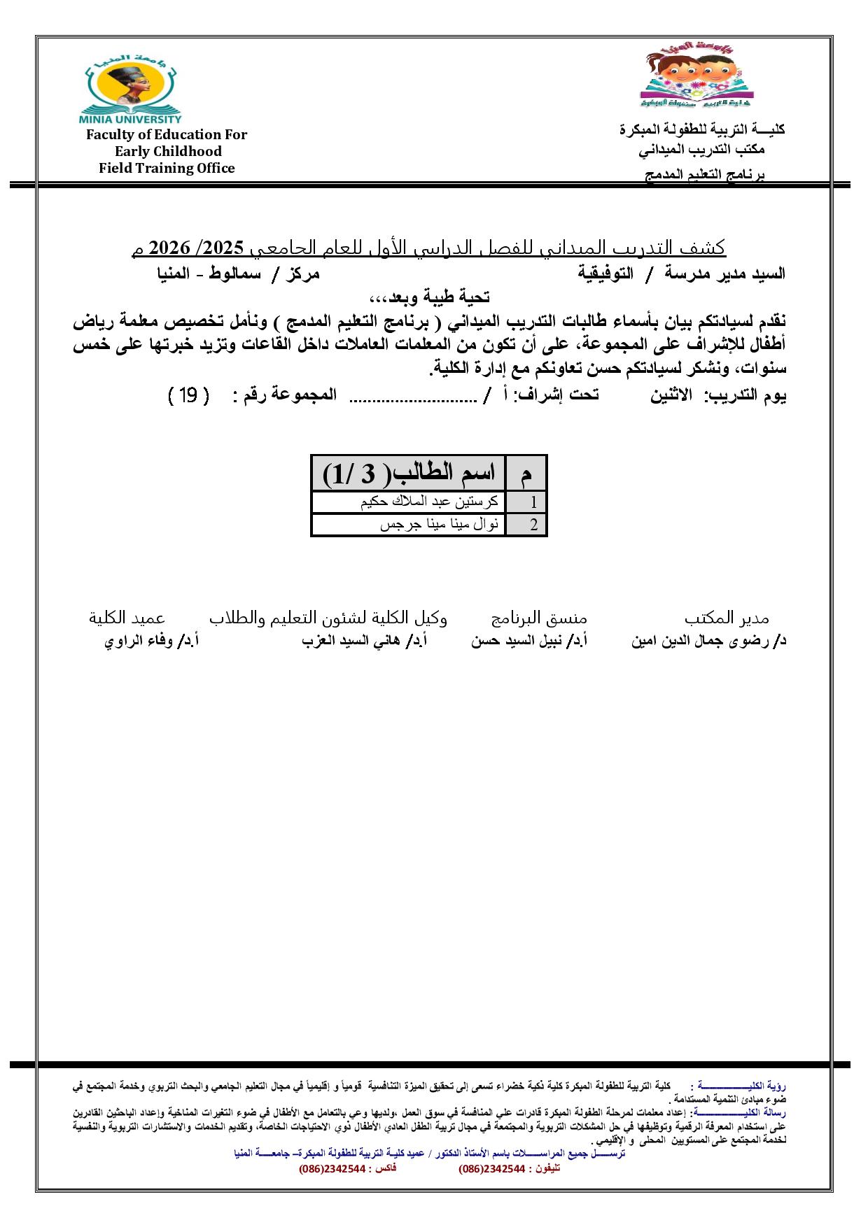 بيان باسماء طالبات التدريب الميدانى ( برنامج التعليم المدمج ) لعام جامعى 2026/2025