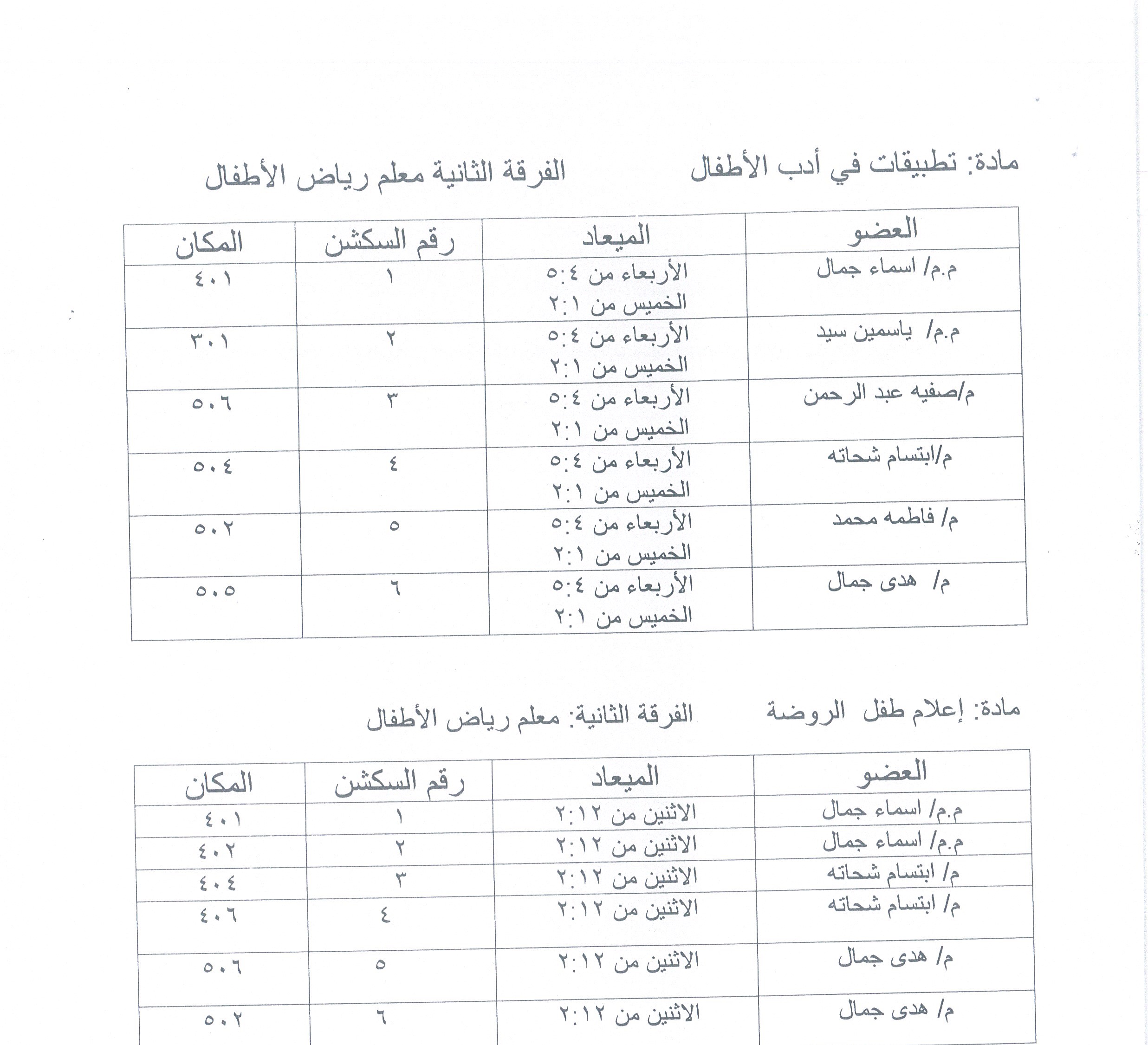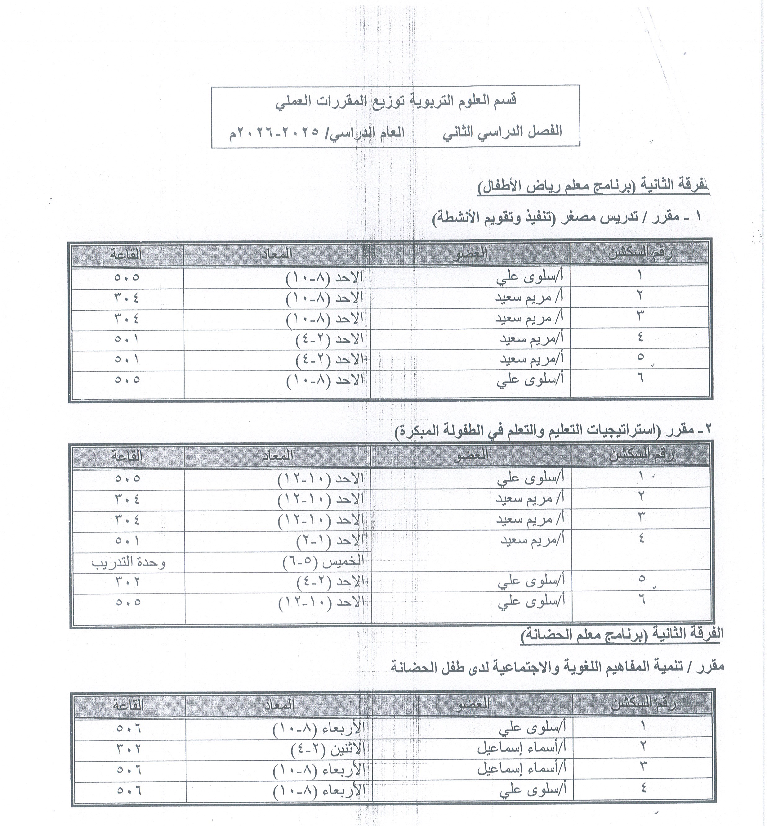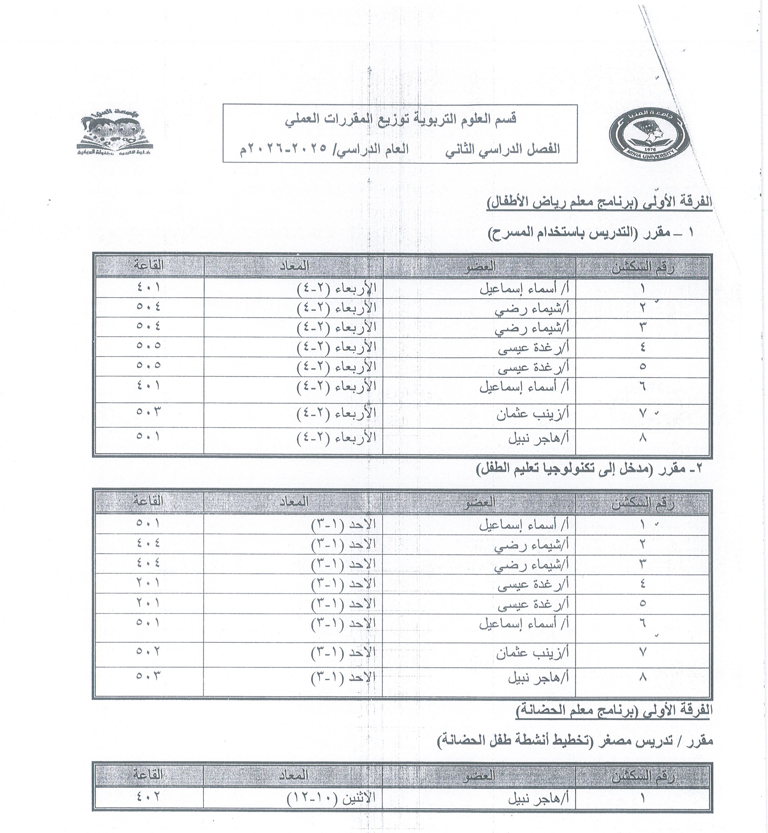توزيع السكاشن الخاصة بالفرقة الأولى والثانية لبرنامج معلم رياض أطفال ومعلم حضانة للفصل الدراسى الثانى لعام جامعى 2026/2025م