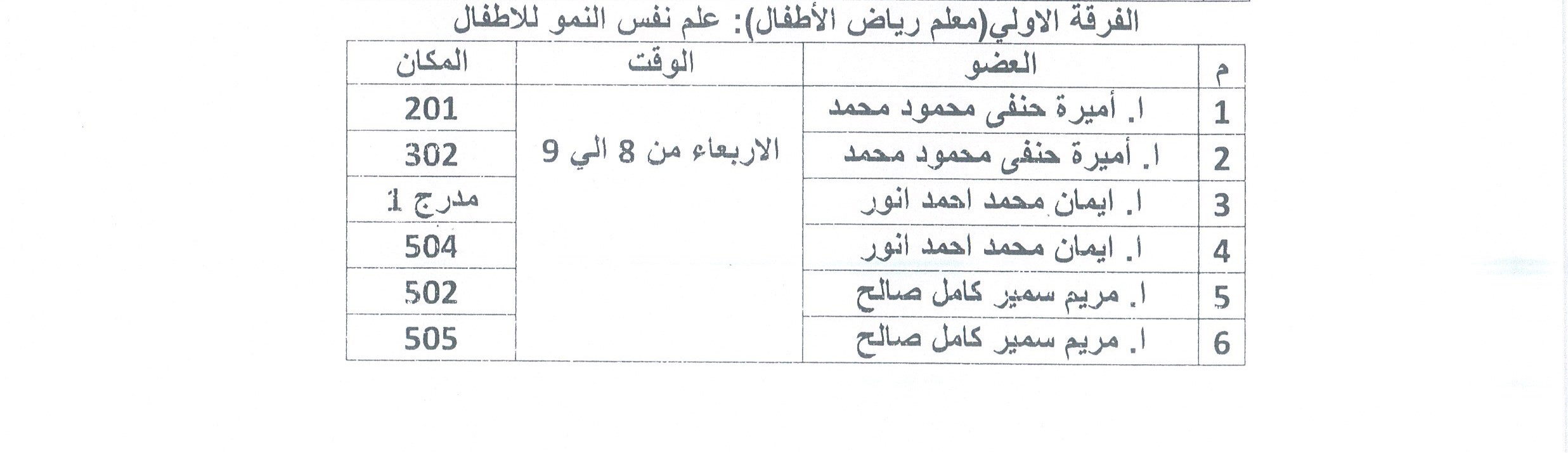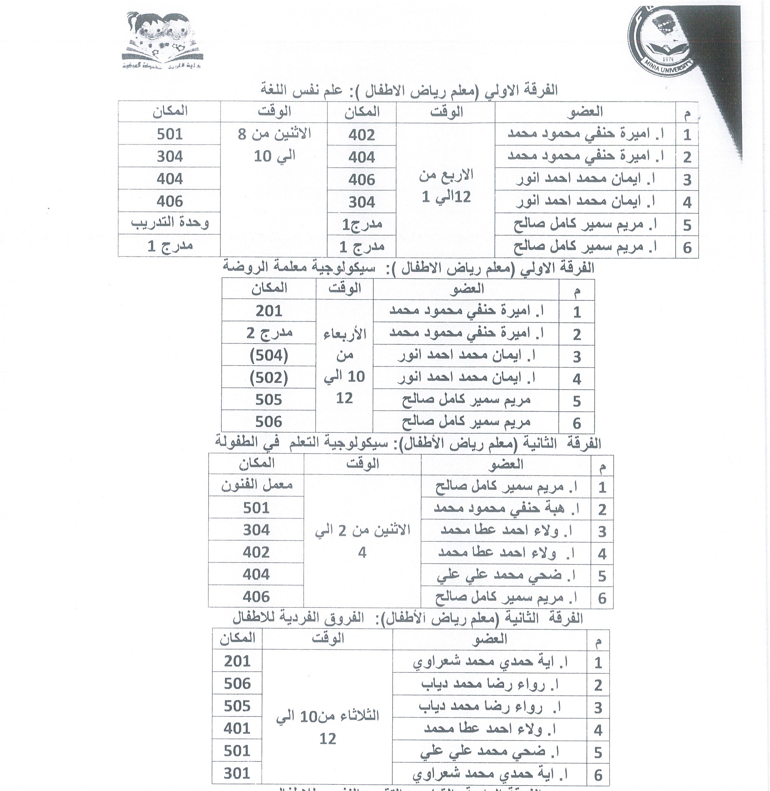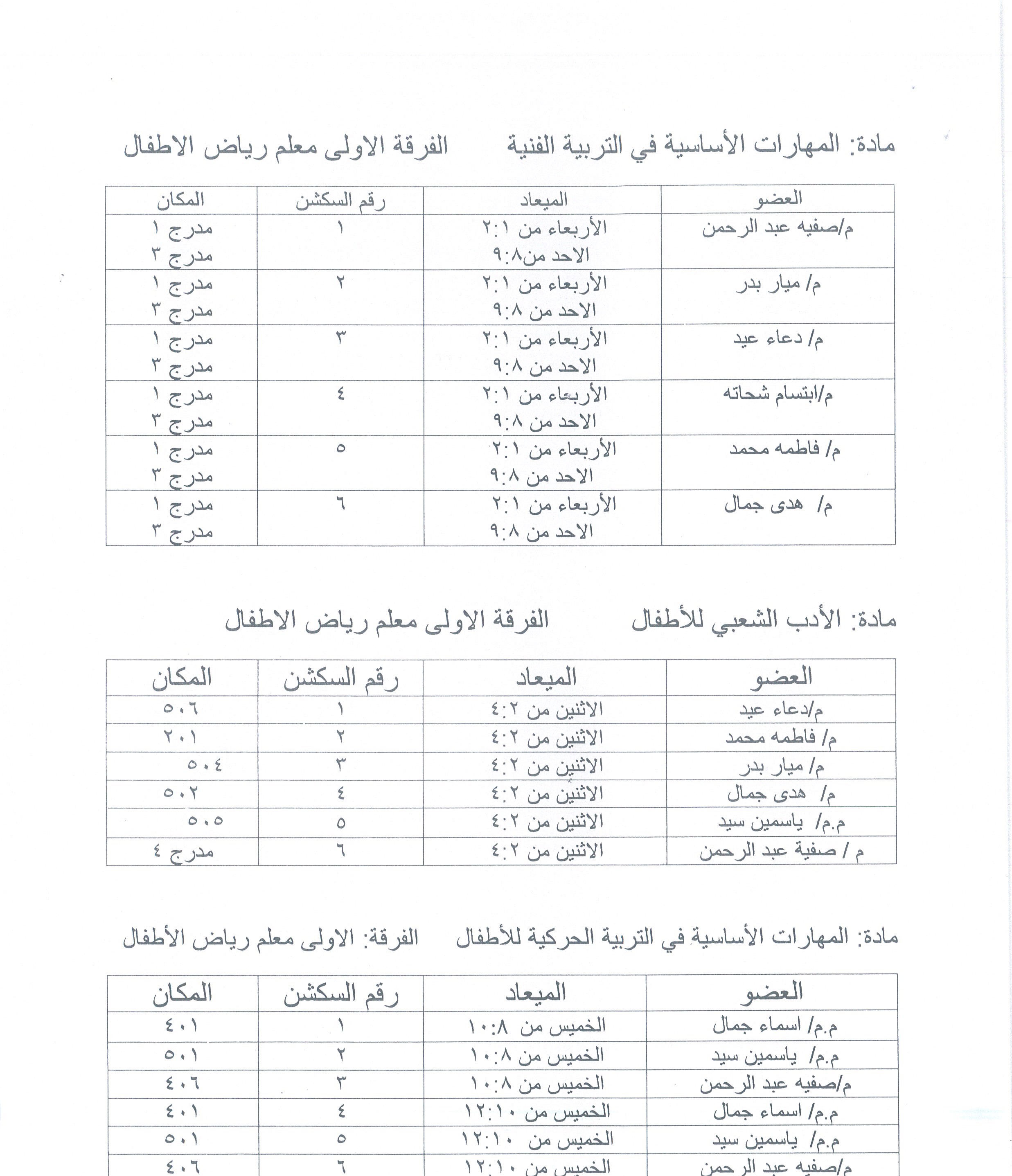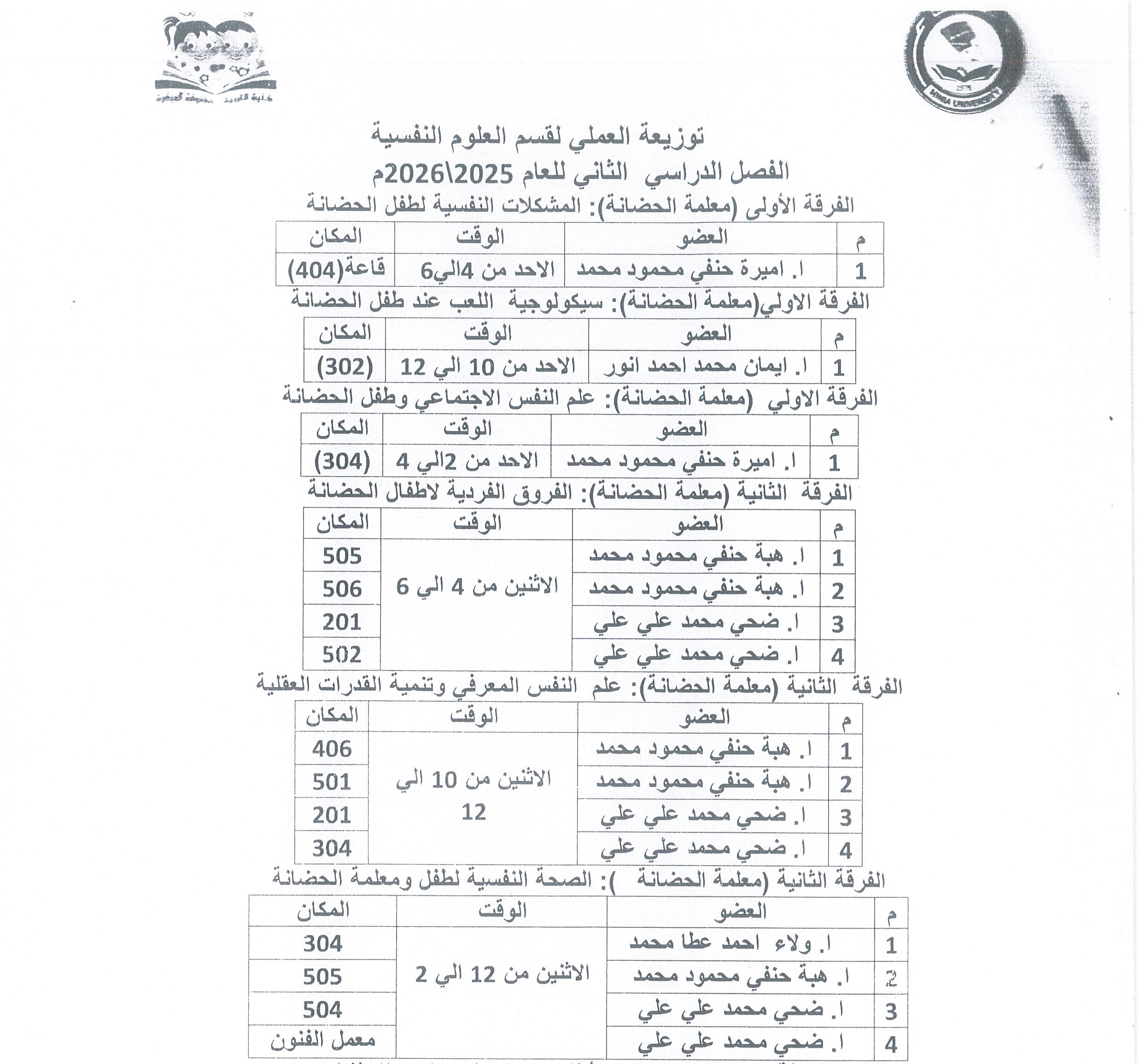 توزيع السكاشن الخاصة بالفرقة الأولى والثانية لبرنامج معلم رياض أطفال ومعلم حضانة للفصل الدراسى الثانى لعام جامعى 2026/2025م