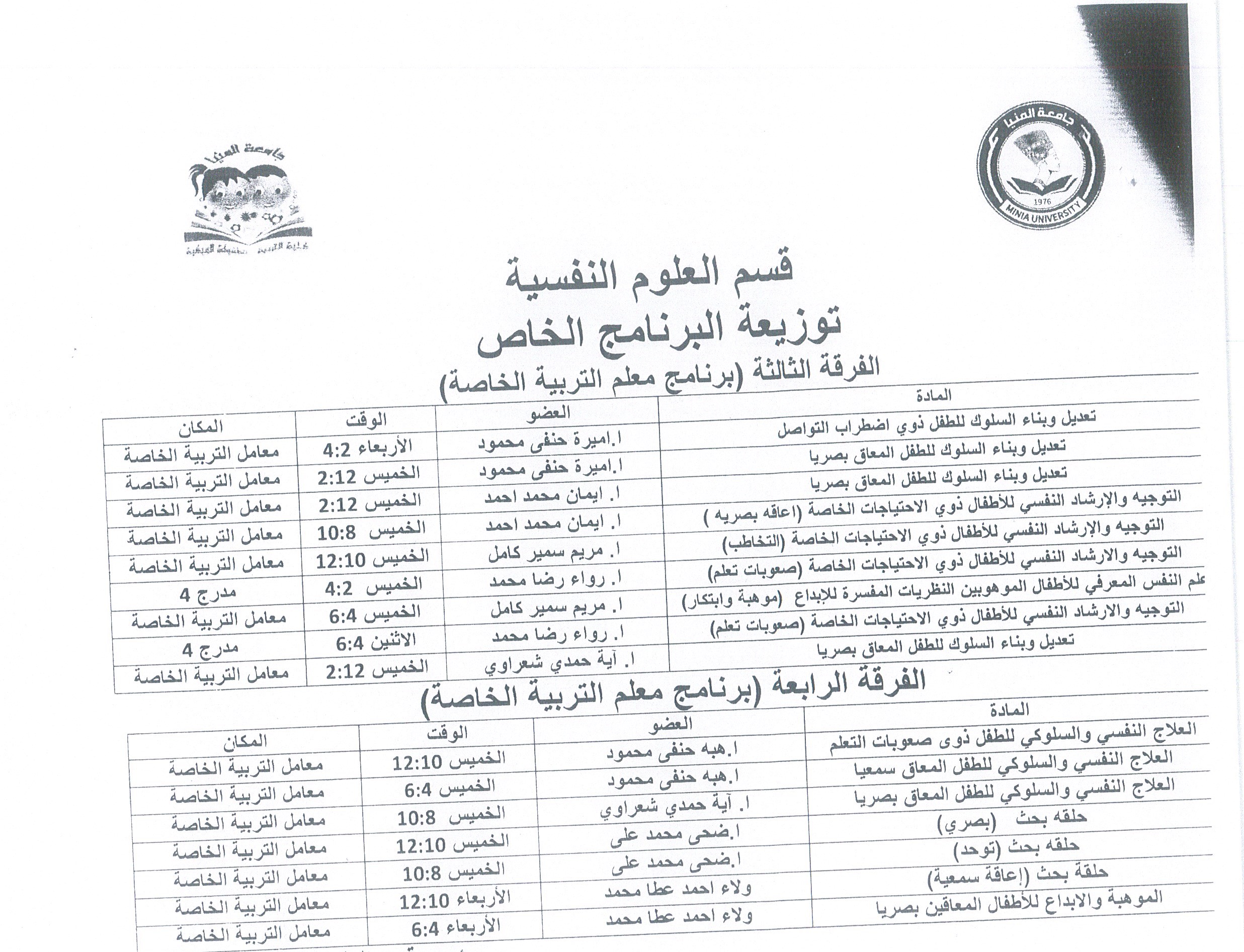 توزيع السكاشن الخاصة لبرنامج معلم التربية الخاصة للفصل الدراسى الثانى لعام جامعى 2026/2025م