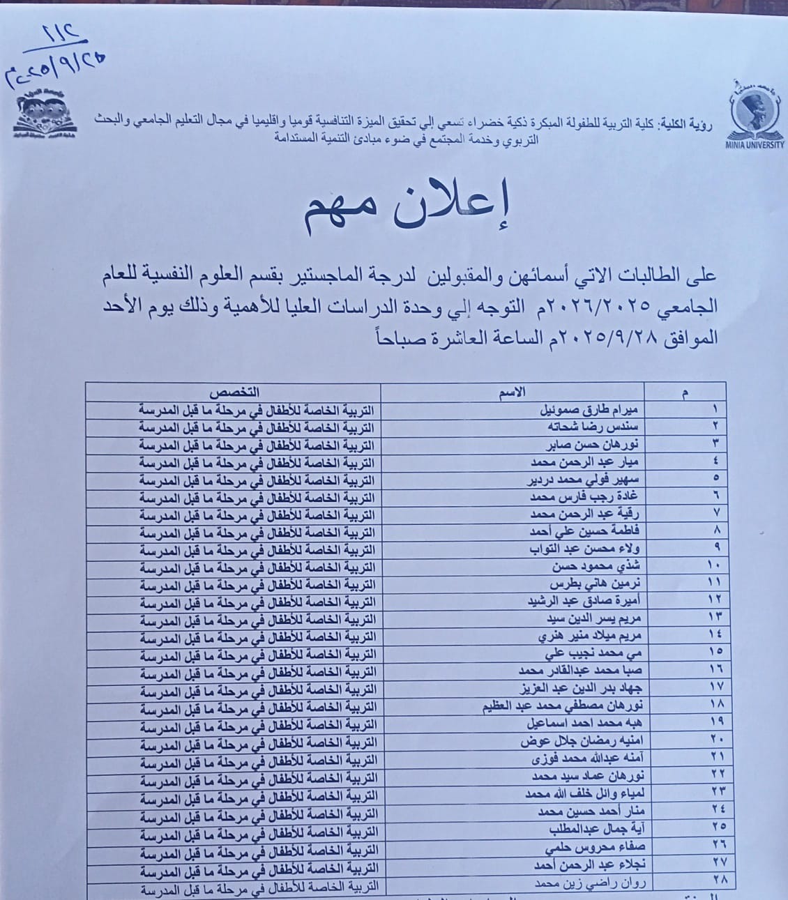 إعلان مهم اسماء الطالبات المقبولين لدرجة الدكتوراه والماجستير بقسم العلوم النفسية لعام جامعى 2026/2025م التوجه إلى وحدة الدراسات العليا للأهمية وذلك يوم الاحد الموافق 2025/9/28م الساعه العاشرة صباحا