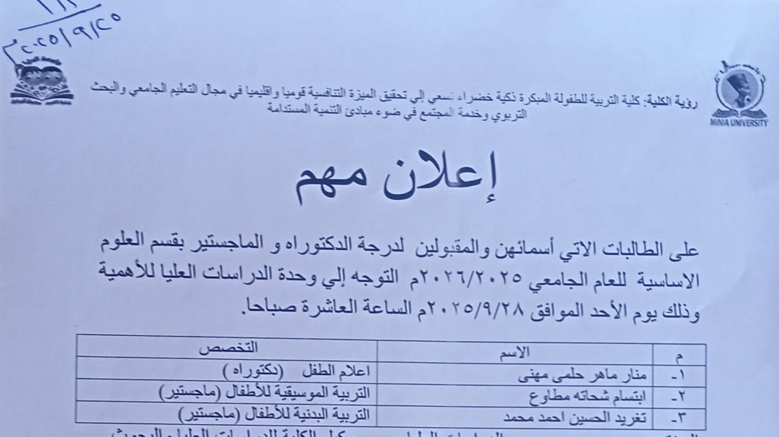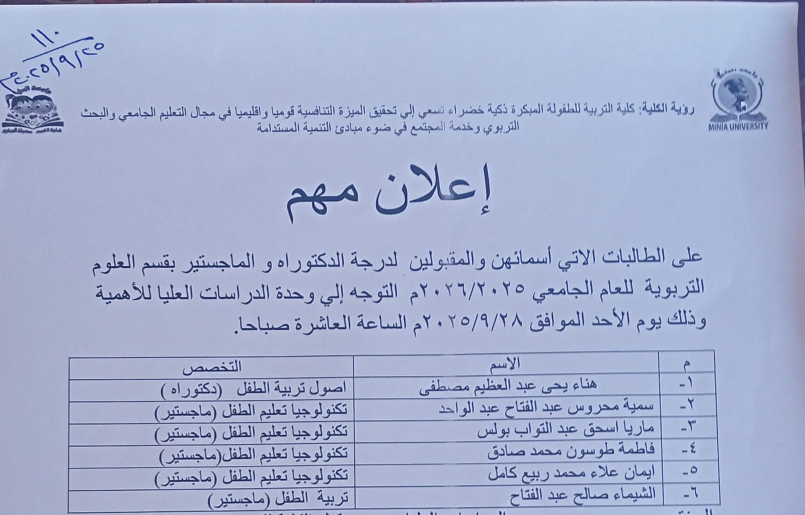 إعلان مهم اسماء الطالبات المقبولين لدرجة الدكتوراه والماجستير بقسم العلوم التربوية لعام جامعى 2026/2025م التوجه إلى وحدة الدراسات العليا للأهمية وذلك يوم الاحد الموافق 2025/9/28م الساعه العاشرة صباحا