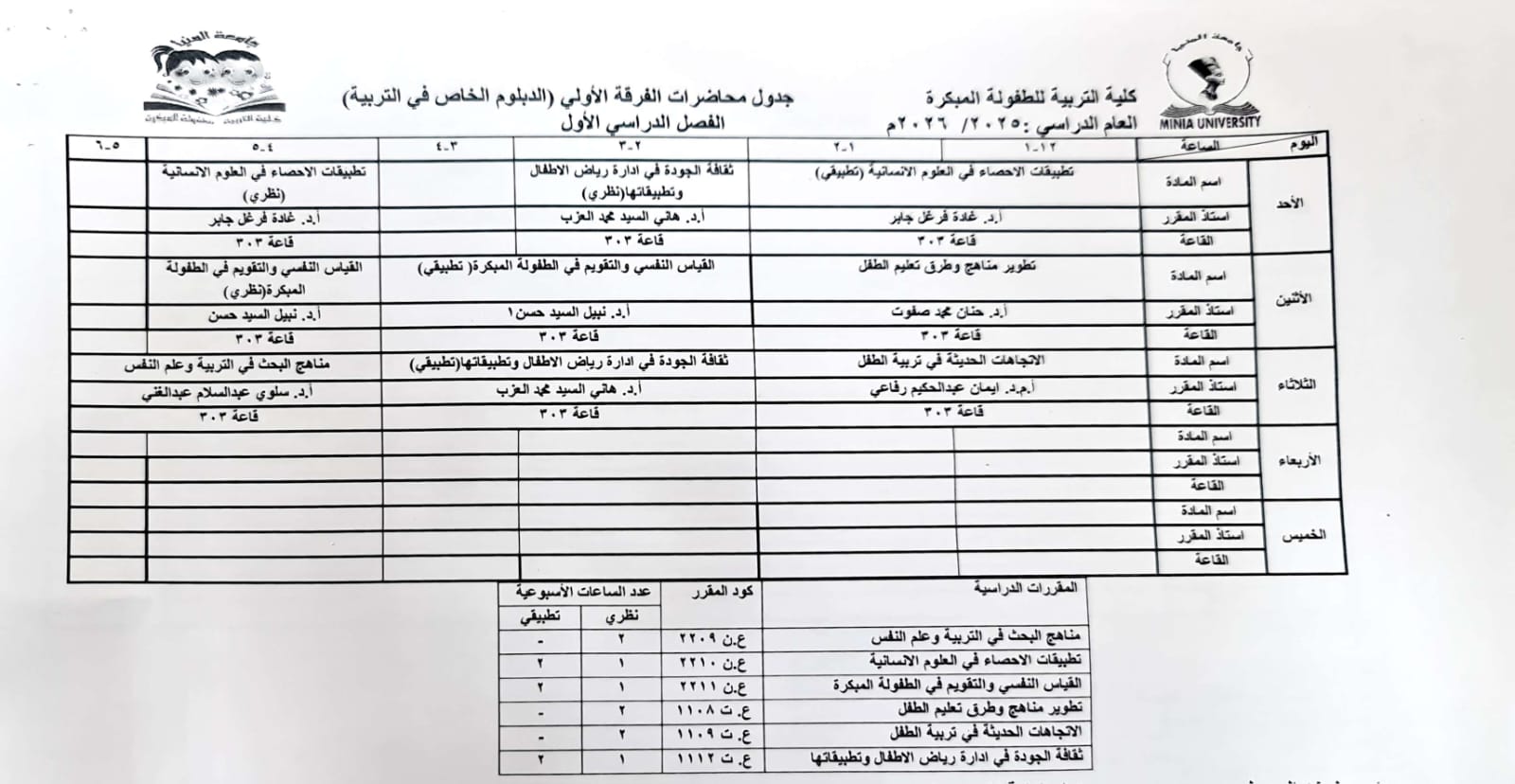 جداول الدراسية للفرقة الثانية للدبلوم الخاص( التربية - التربية الفنية - الارشاد النفسى للاطفال - التربية الموسيقية للاطفال - تربية الطفل - تكنولوجيا التعليم للاطفال )