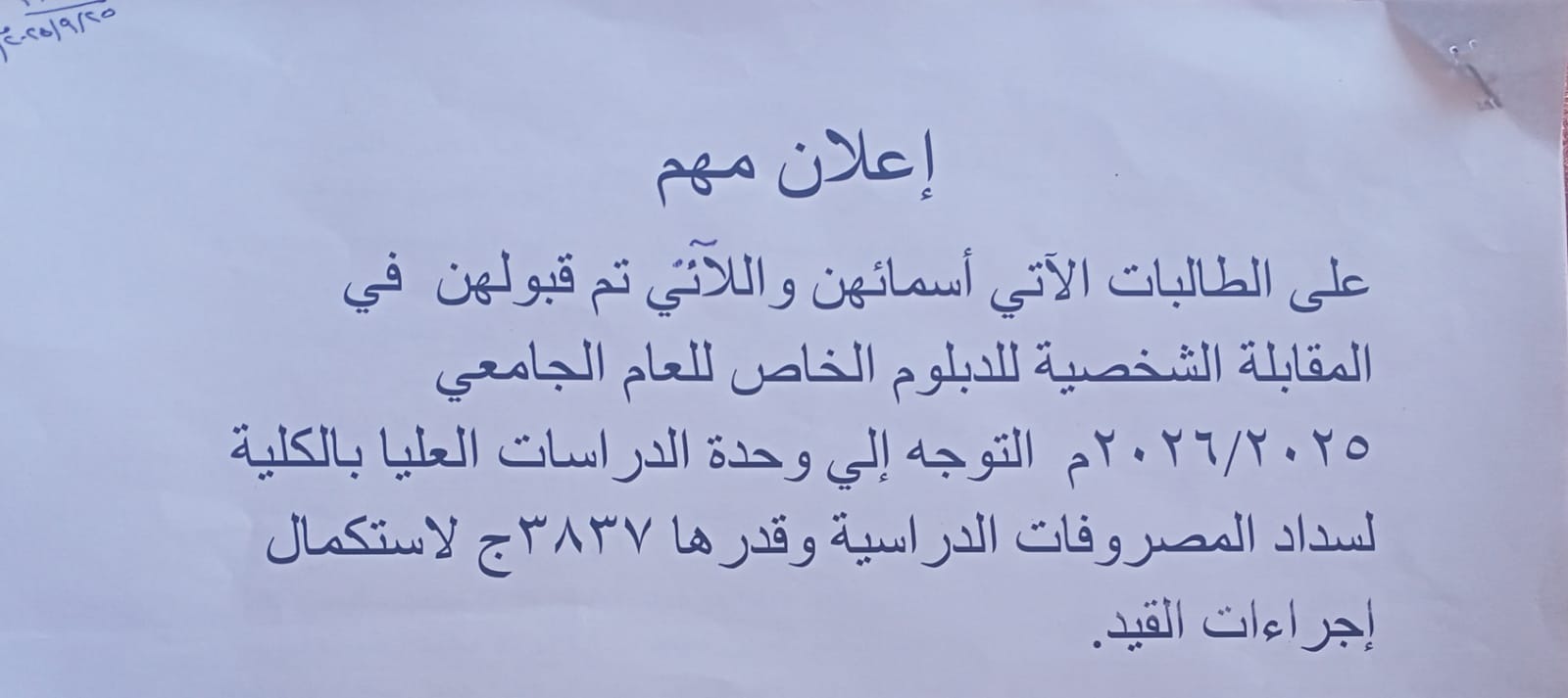 إعلان مهم اسماء الطالبات اللاتى تم قبولهن في المقابلات الشخصية للدبلوم الخاص للعام الجامعي 2026/2025م التوجه إلى وحدة الدراسات العليا بالكلية لسداد المصروفات الدراسيه لاستكمال إجراءات القيد